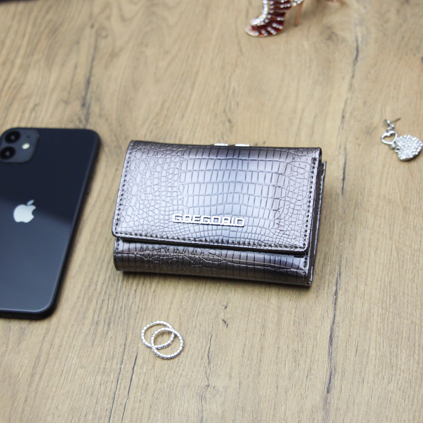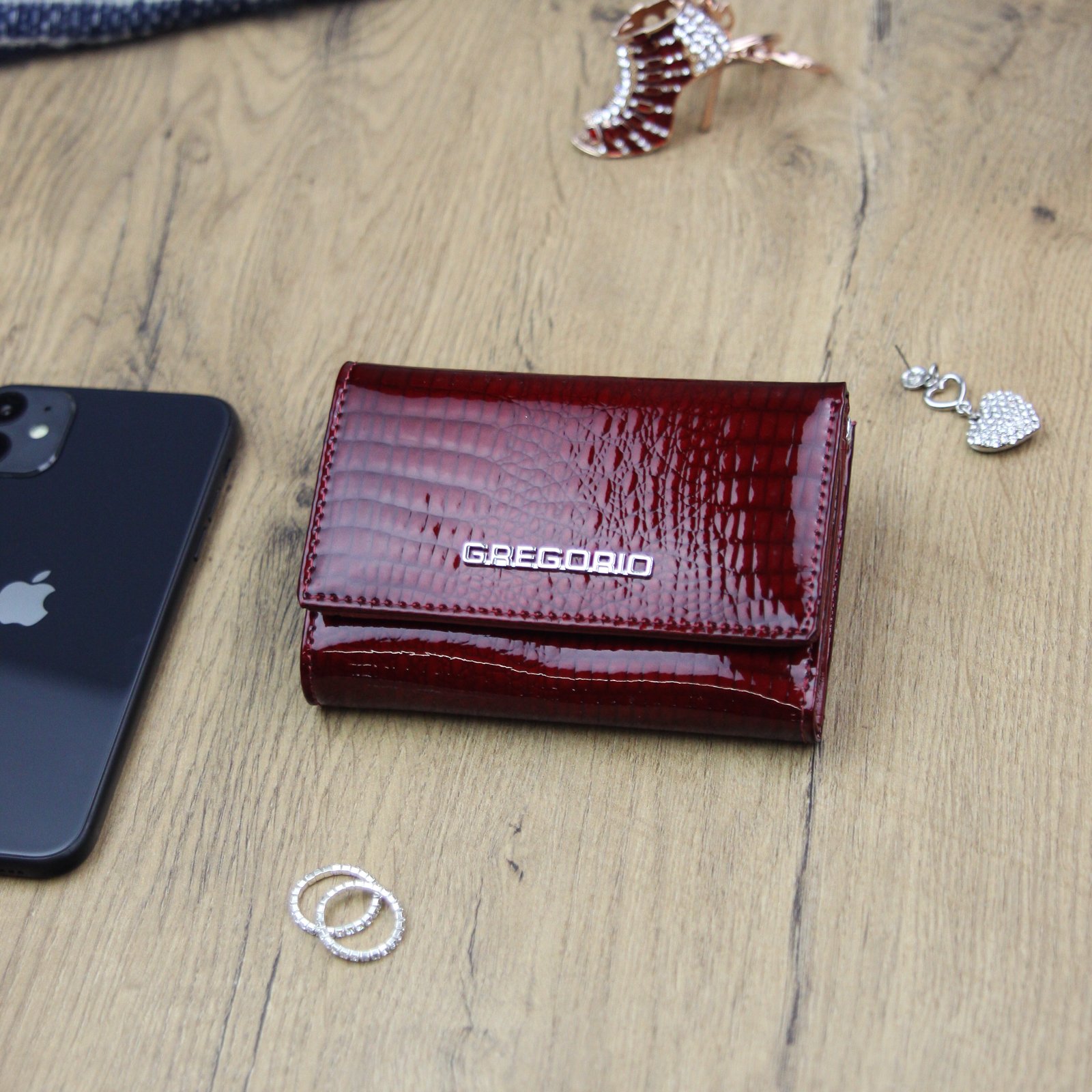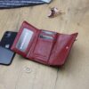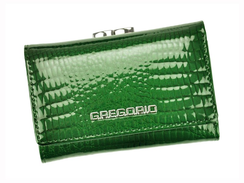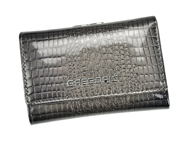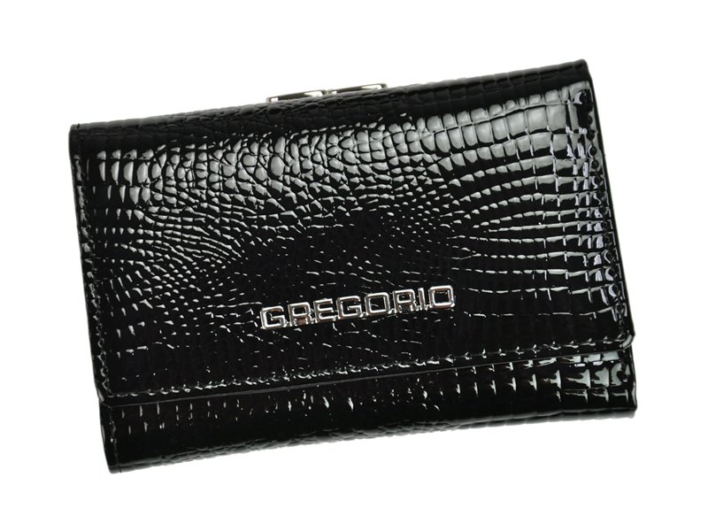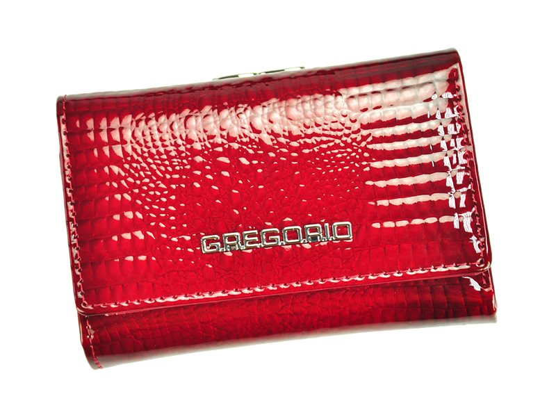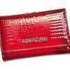 Nieduży portfel damski, wykonany z najwyższej jakości naturalnej, włoskiej skóry licowej lakierowanej, wytłoczonej w rysunek skóry krokodyla.