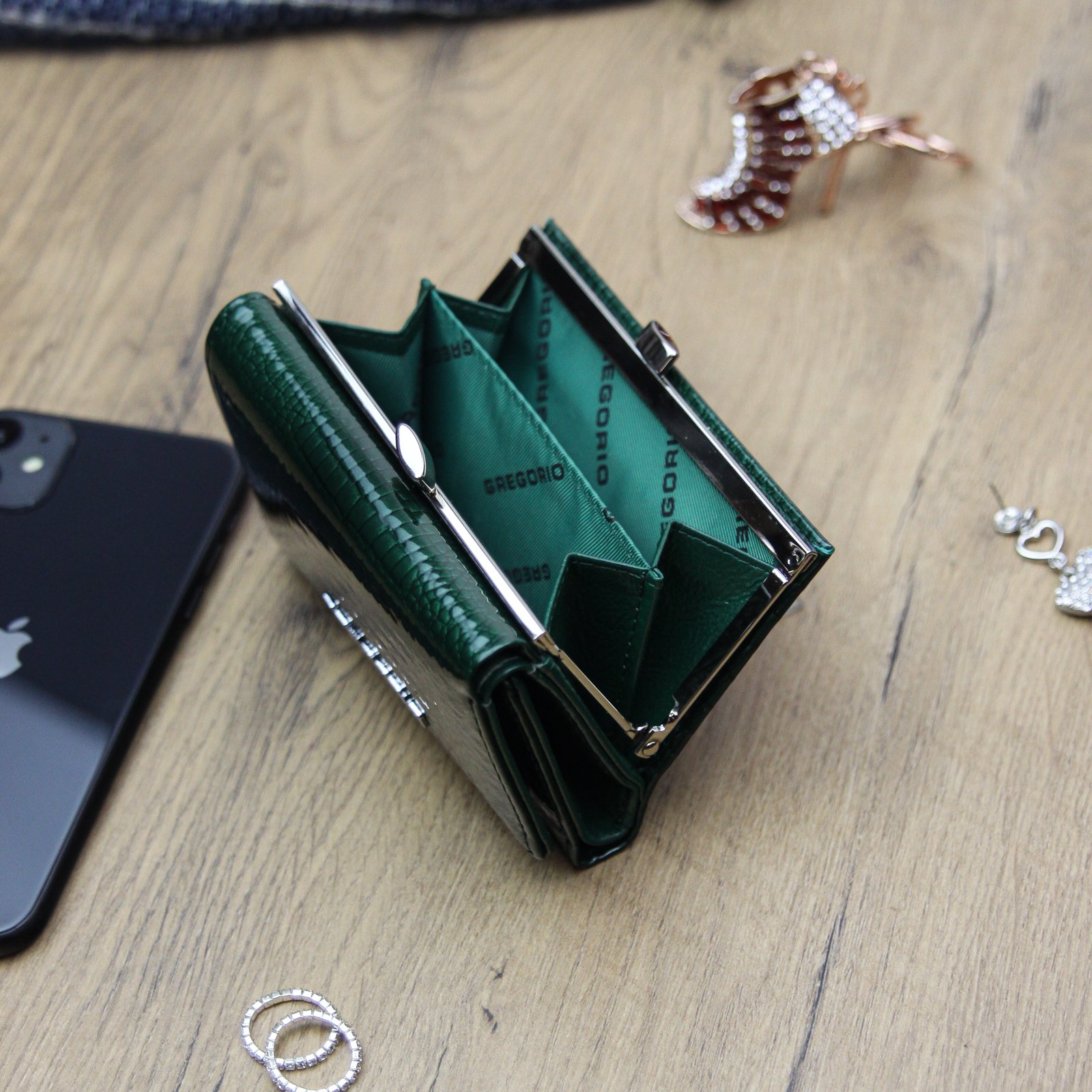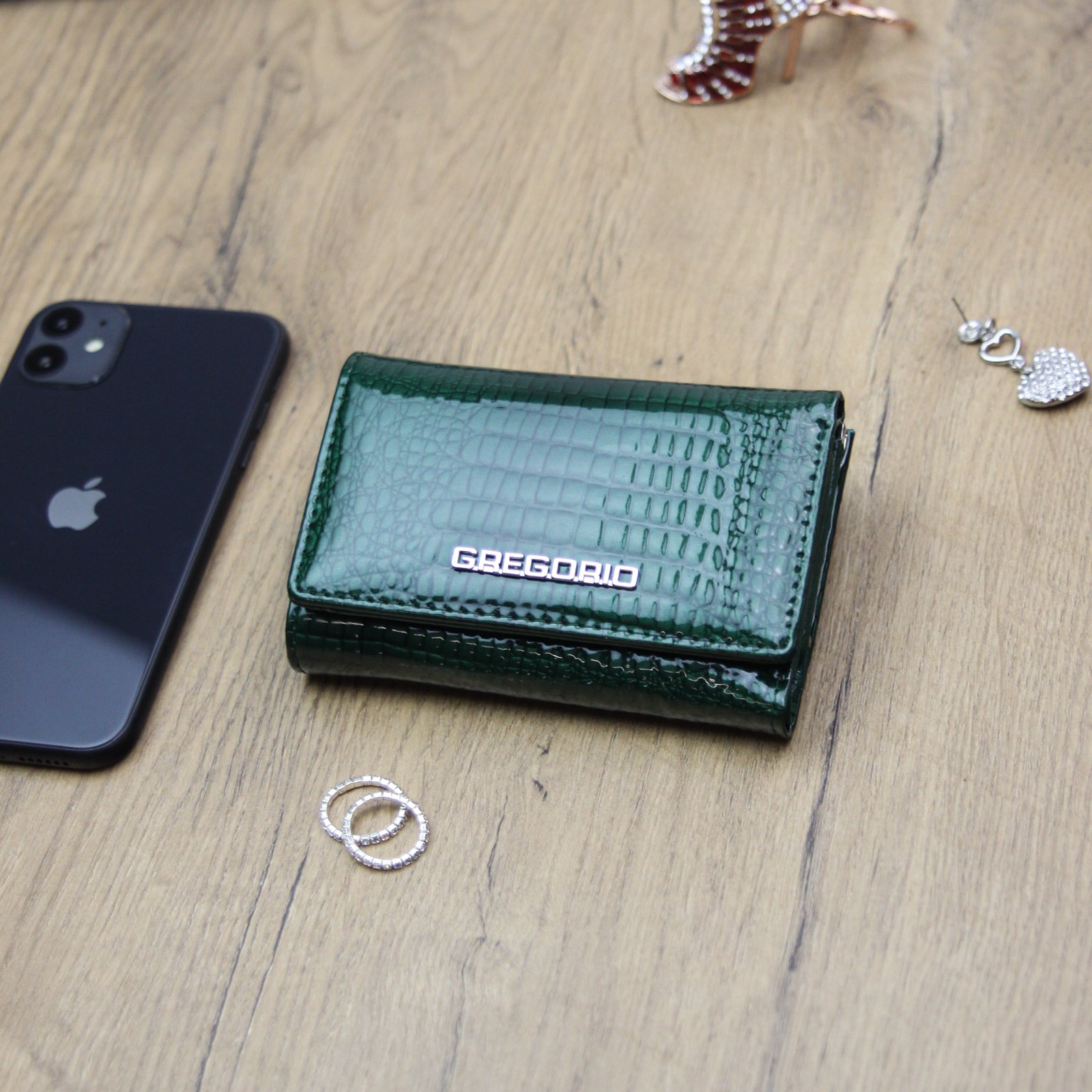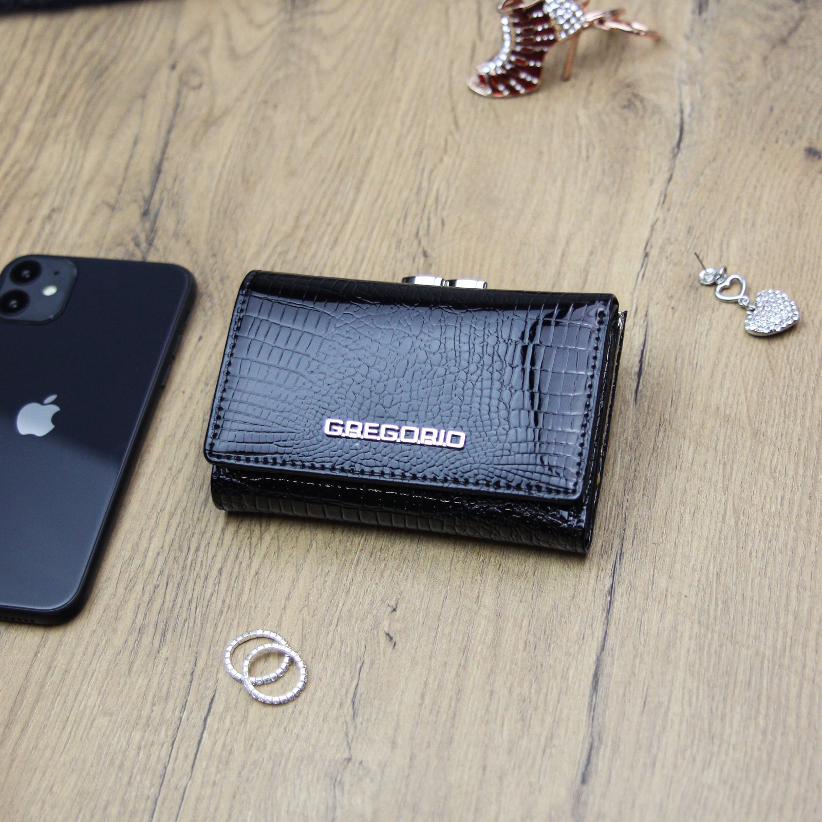 Nieduży portfel damski, wykonany z najwyższej jakości naturalnej, włoskiej skóry licowej lakierowanej, wytłoczonej w rysunek skóry krokodyla.
