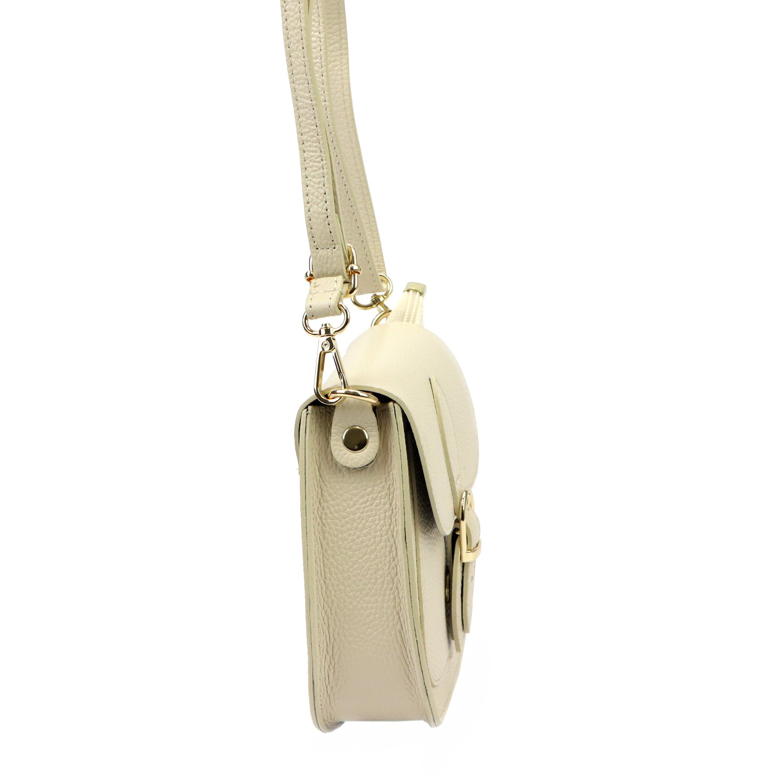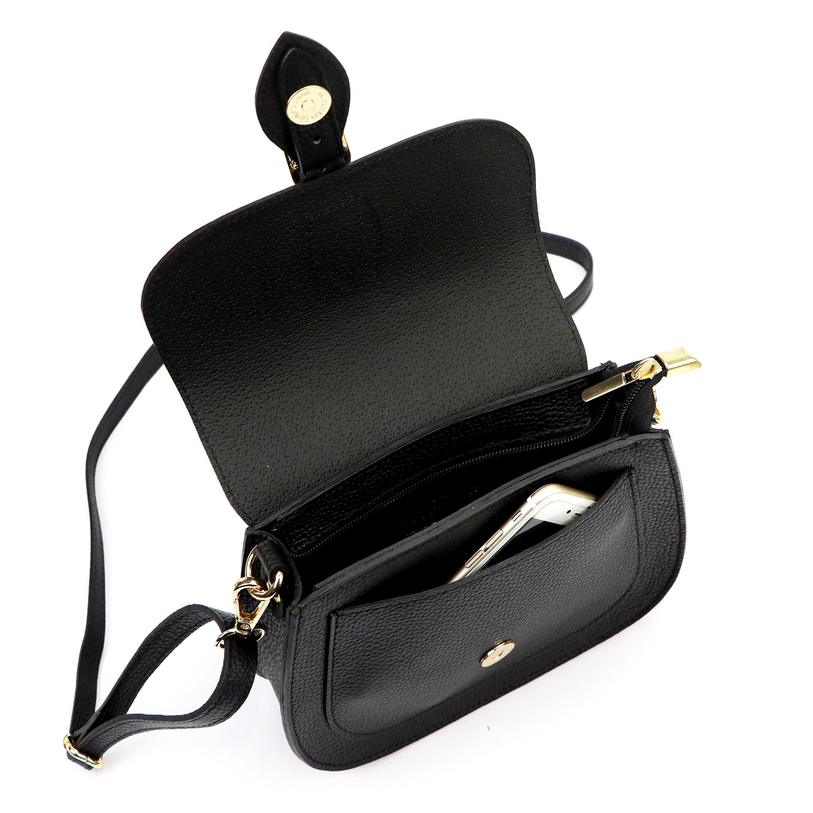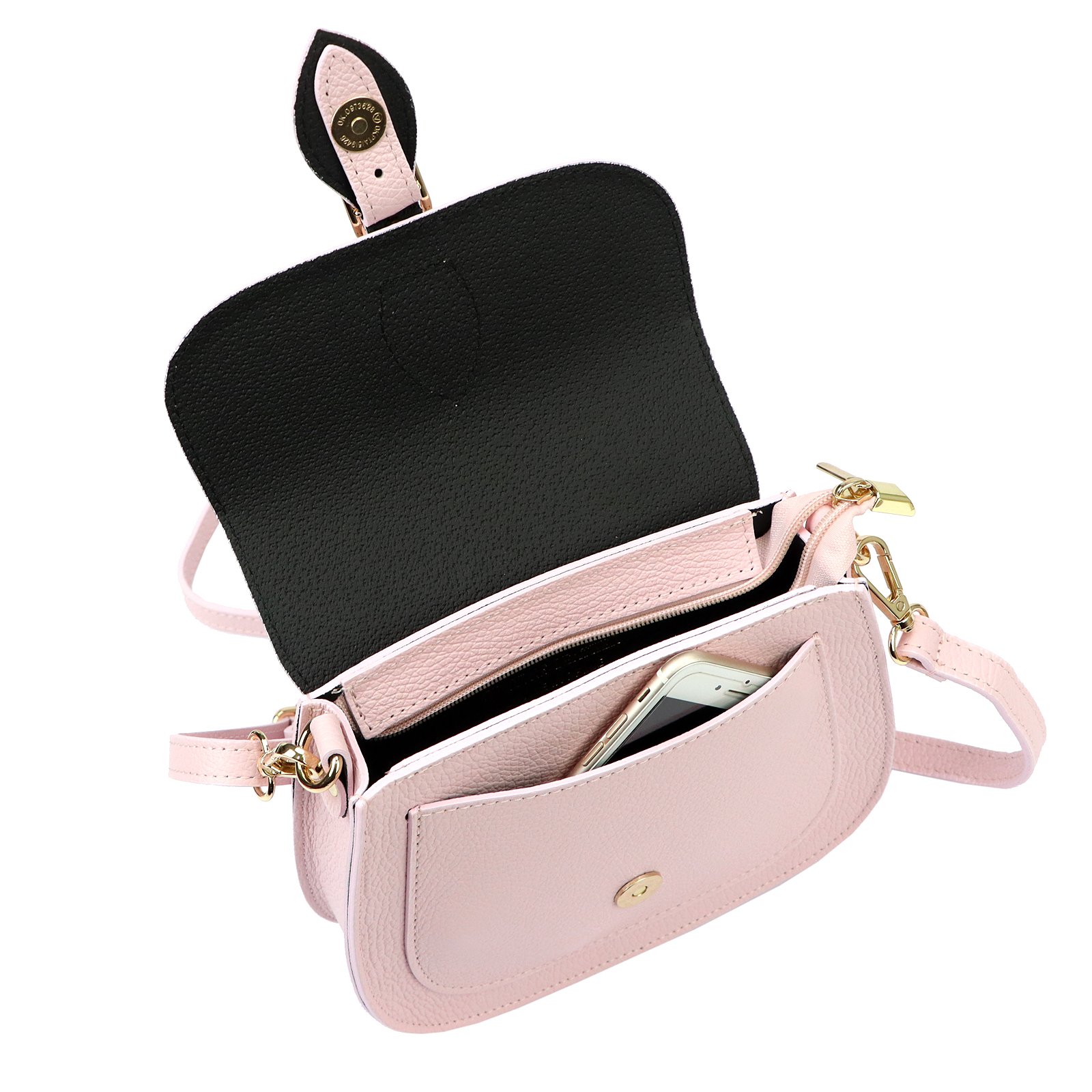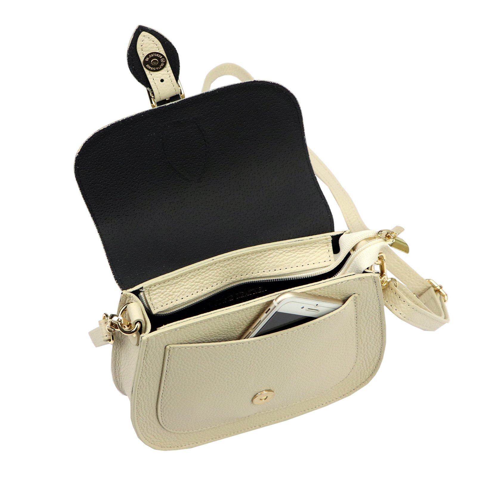 Mała torebka-listonoszka z naturalnej, włoskiej skóry licowej. Torebka ma budowę jednokomorową, wykończoną trwałą podszewką. Na froncie naszyta jest kieszeń, mieszcząca smartfon. Całość zamykana jest zamkiem błyskawicznym i klapą z zatrzaskiem magnetycznym. Długi pasek pozwala wygodnie nosić ją na ramieniu lub na ukos przez pierś.