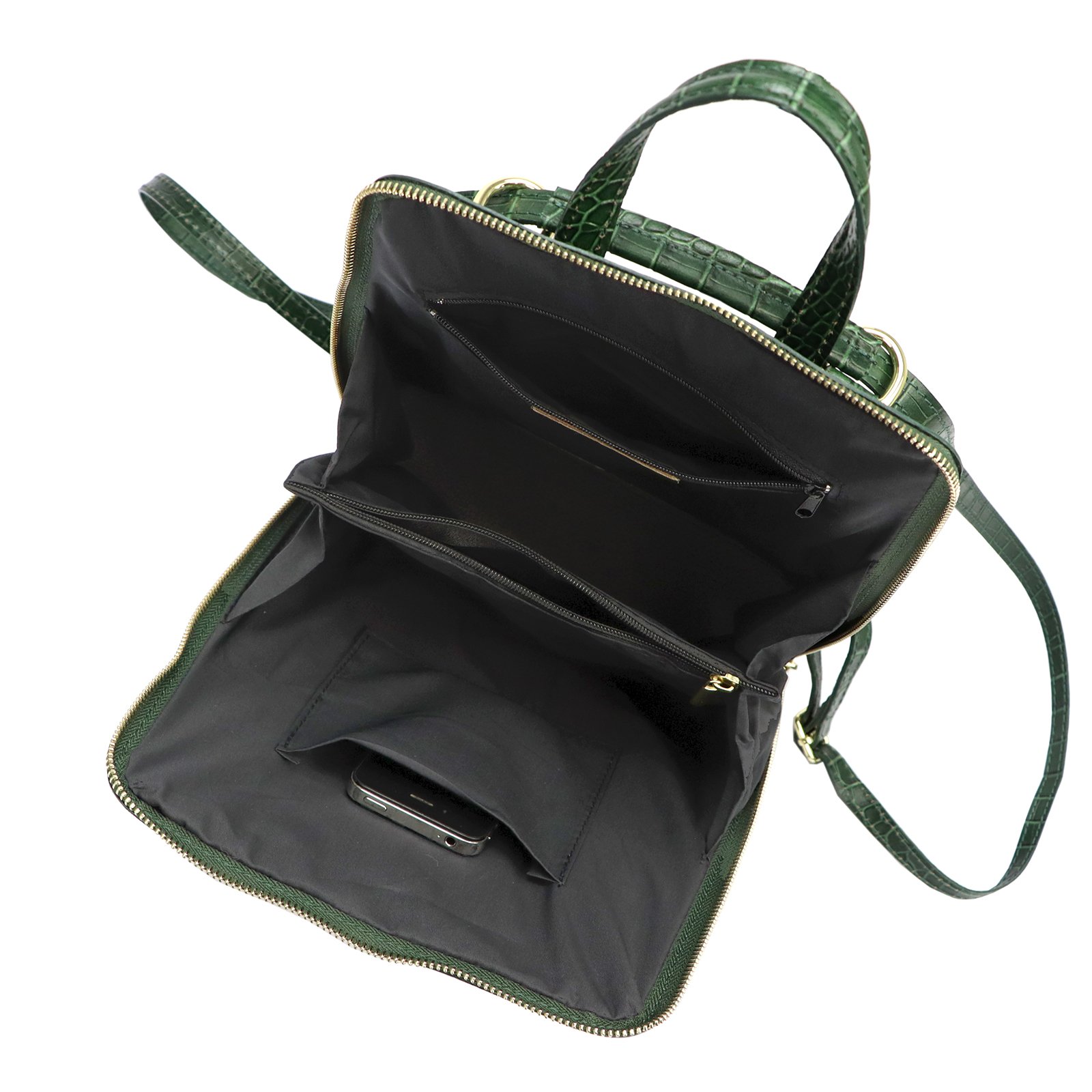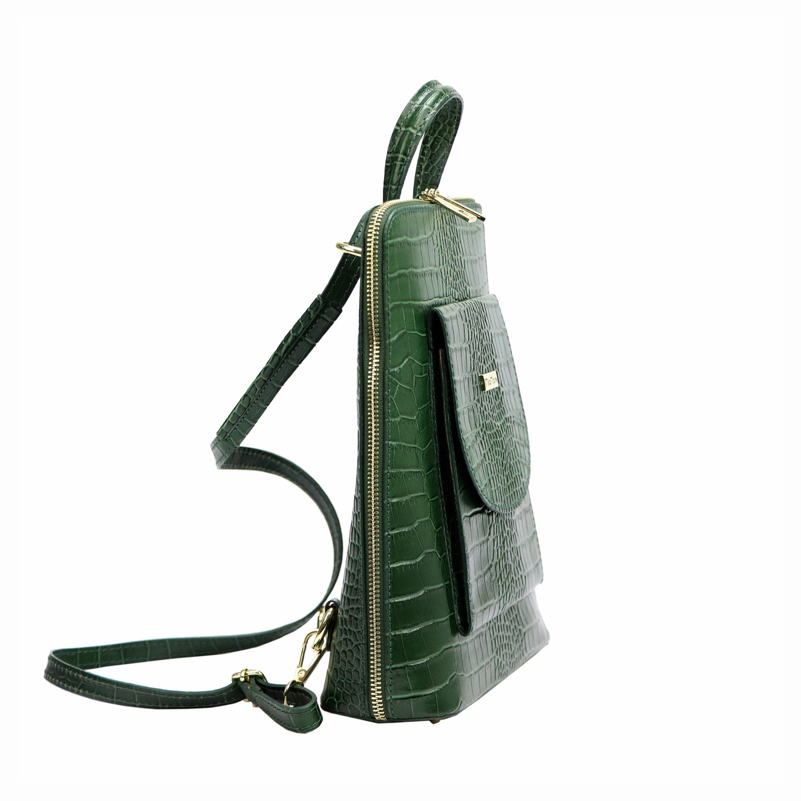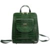 Średniej wielkości plecak z naturalnej, włoskiej skóry bydlęcej wytłoczonej w rysunek skóry krokodyla. Plecak ma budowę jednokomorową z podszewkową przegrodą, zapinaną na suwak. Wnętrze wyposażono w kieszonkę zapinaną na suwak i kieszeń na telefon. Na froncie plecaka umieszczono dodatkową kieszeń zamykaną klapą z zatrzaskiem magnetycznym. Całość zamykana jest metalowym, dwusuwakowym zamkiem błyskawicznym. Na tylnej ściance torebki znajduje się jeszcze jedna, zapinana suwakiem, kieszonka. Paski naramienne plecaka można przepiąć w ten sposób, że tworzą one jeden długi pasek, który pozwala nosić plecak jako torebkę na ramię. Denko plecaka jest usztywnione i wyposażone w metalowe nóżki, co zapobiega deformacji jego kształtu i uszkodzeniom skóry.