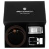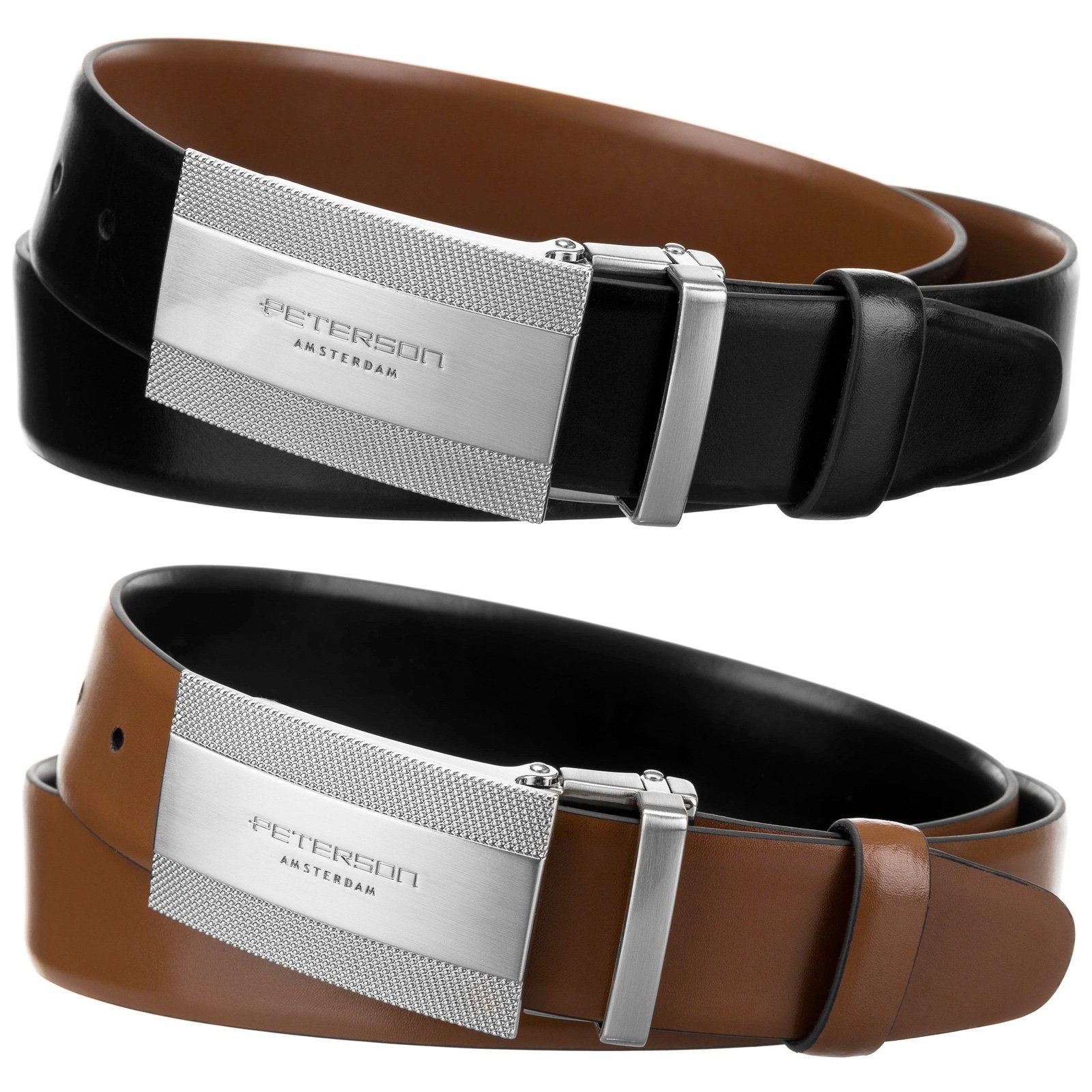 Zestaw prezentowy – dwustronny czarno/brązowy pasek skórzany oraz dwie wymienne klamry – pełna i klasyczna.