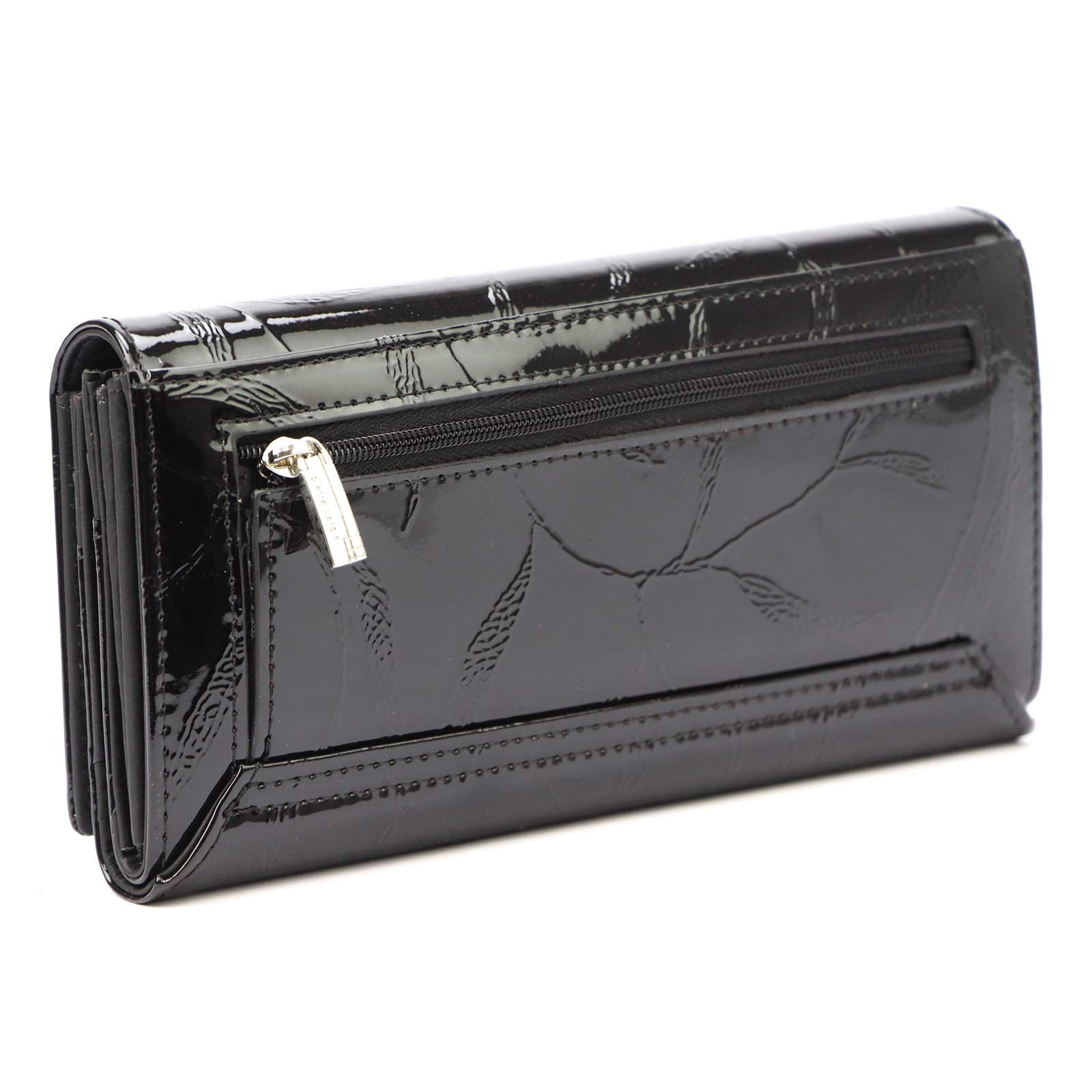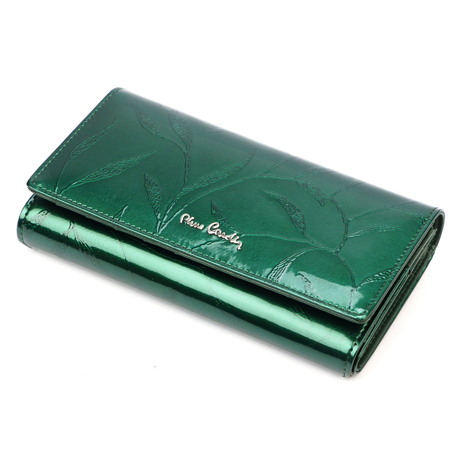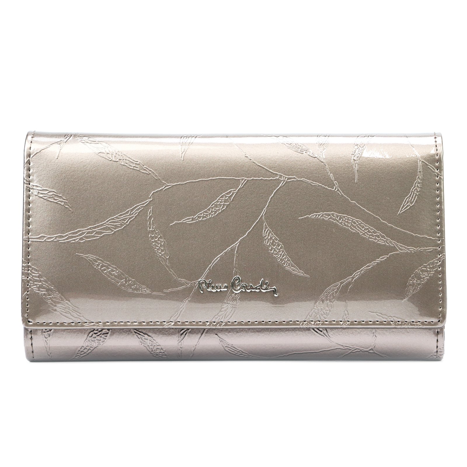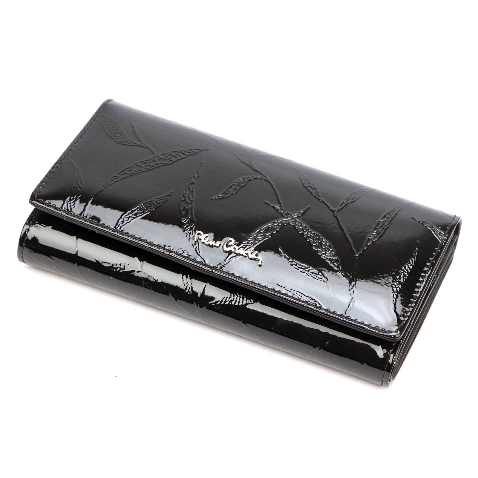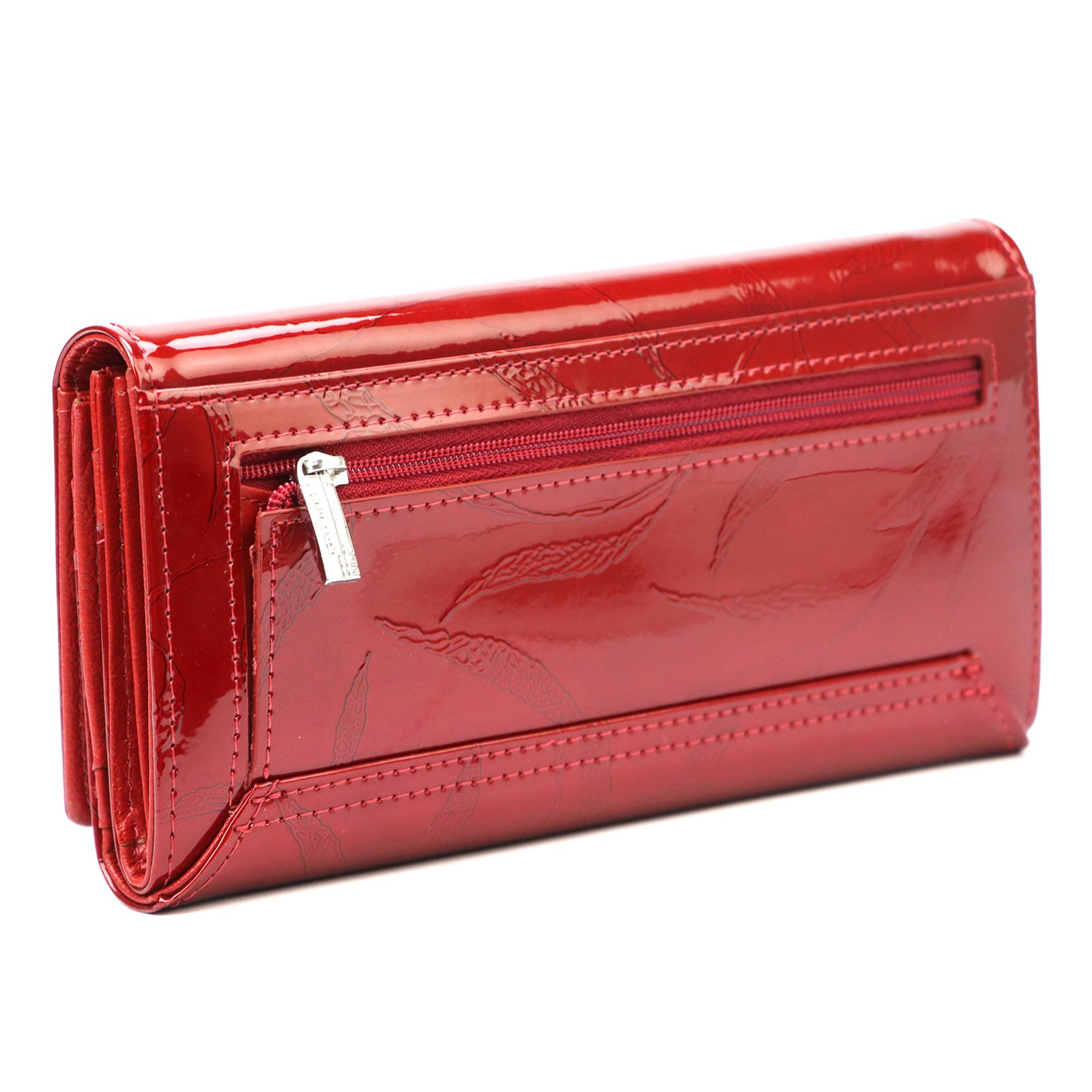 Duży portfel damski, wykonany z najwyższej jakości naturalnej, włoskiej skóry licowej lakierowanej, z wytłoczonym, delikatnym motywem liści.