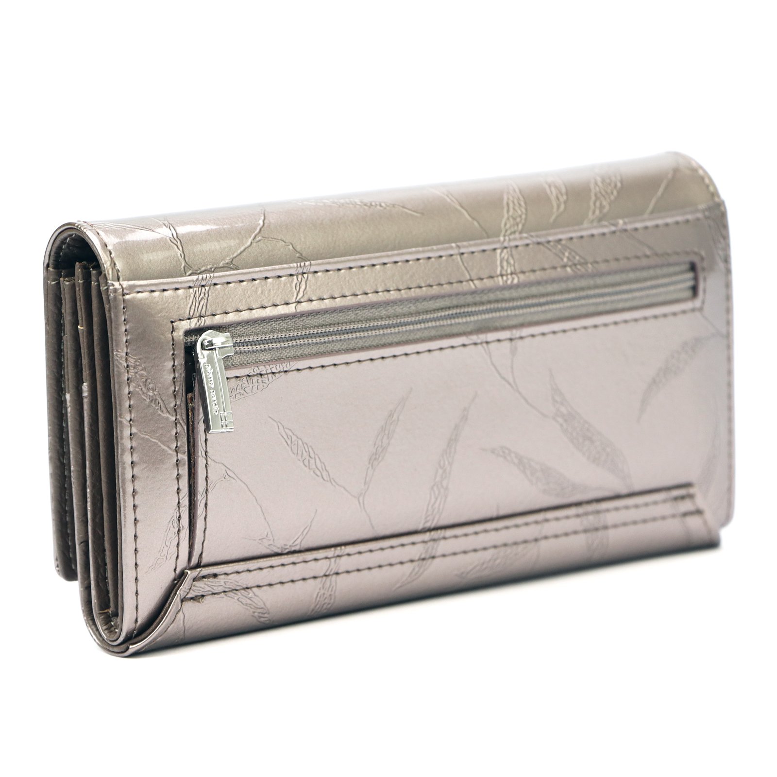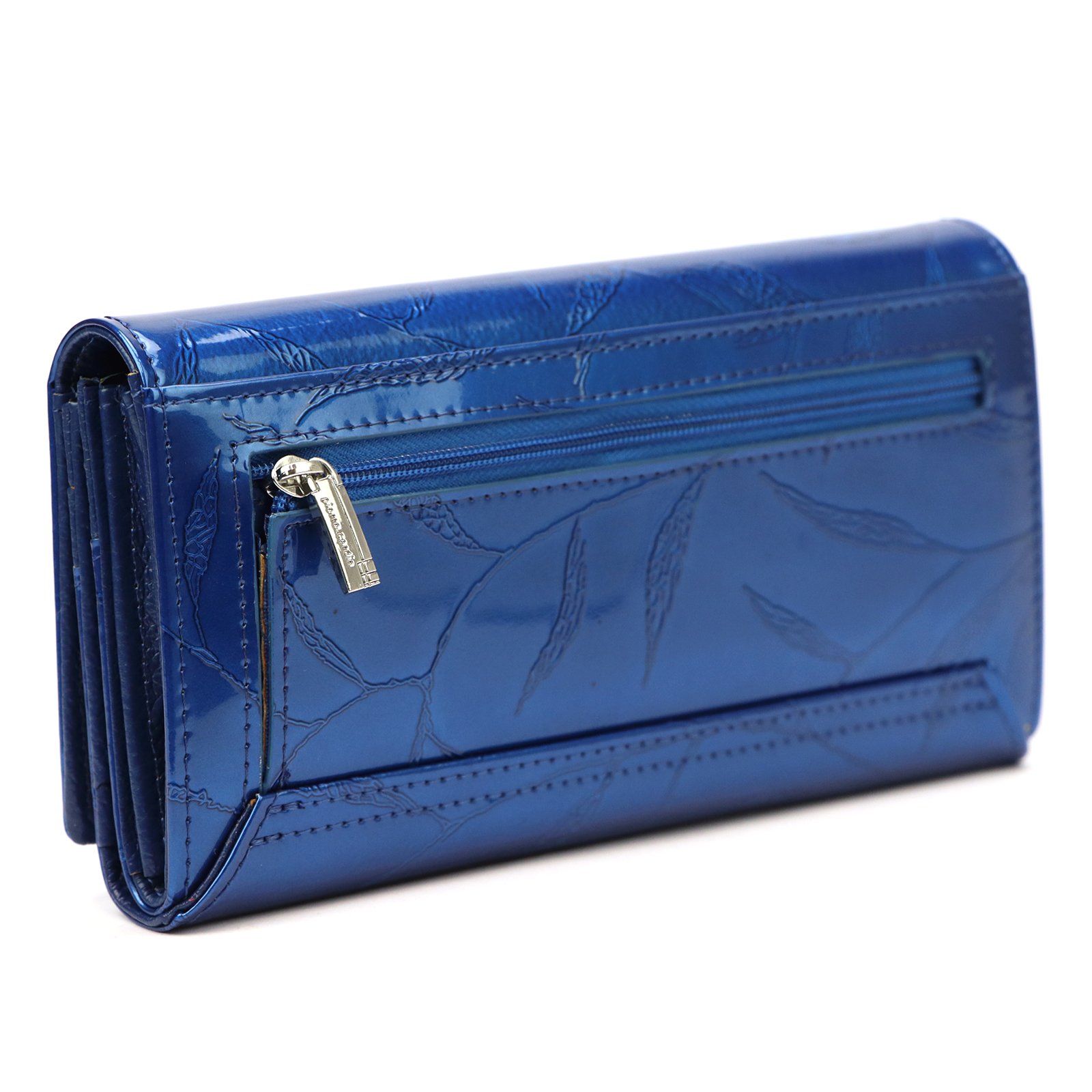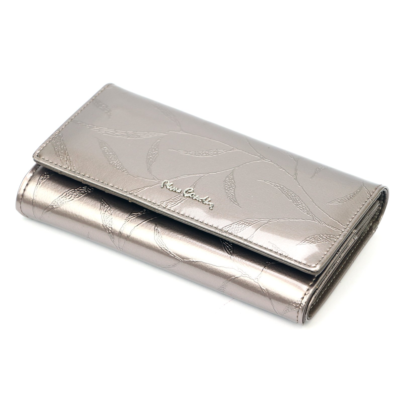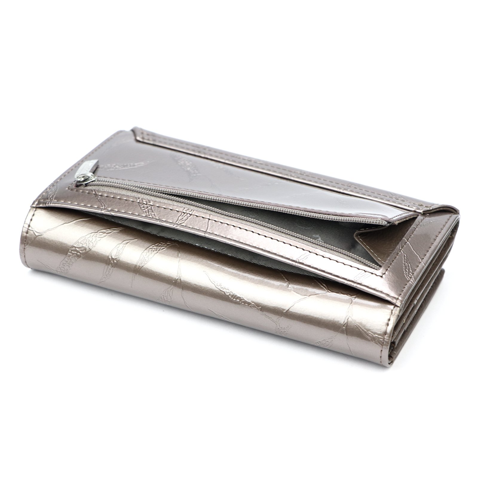 Duży portfel damski, wykonany z najwyższej jakości naturalnej, włoskiej skóry licowej lakierowanej, z wytłoczonym, delikatnym motywem liści.