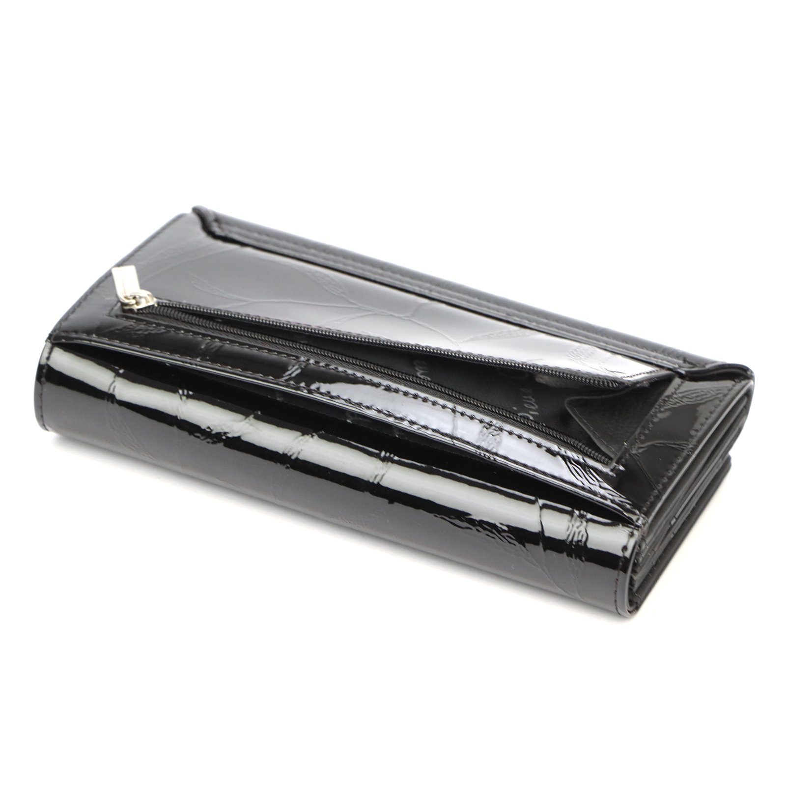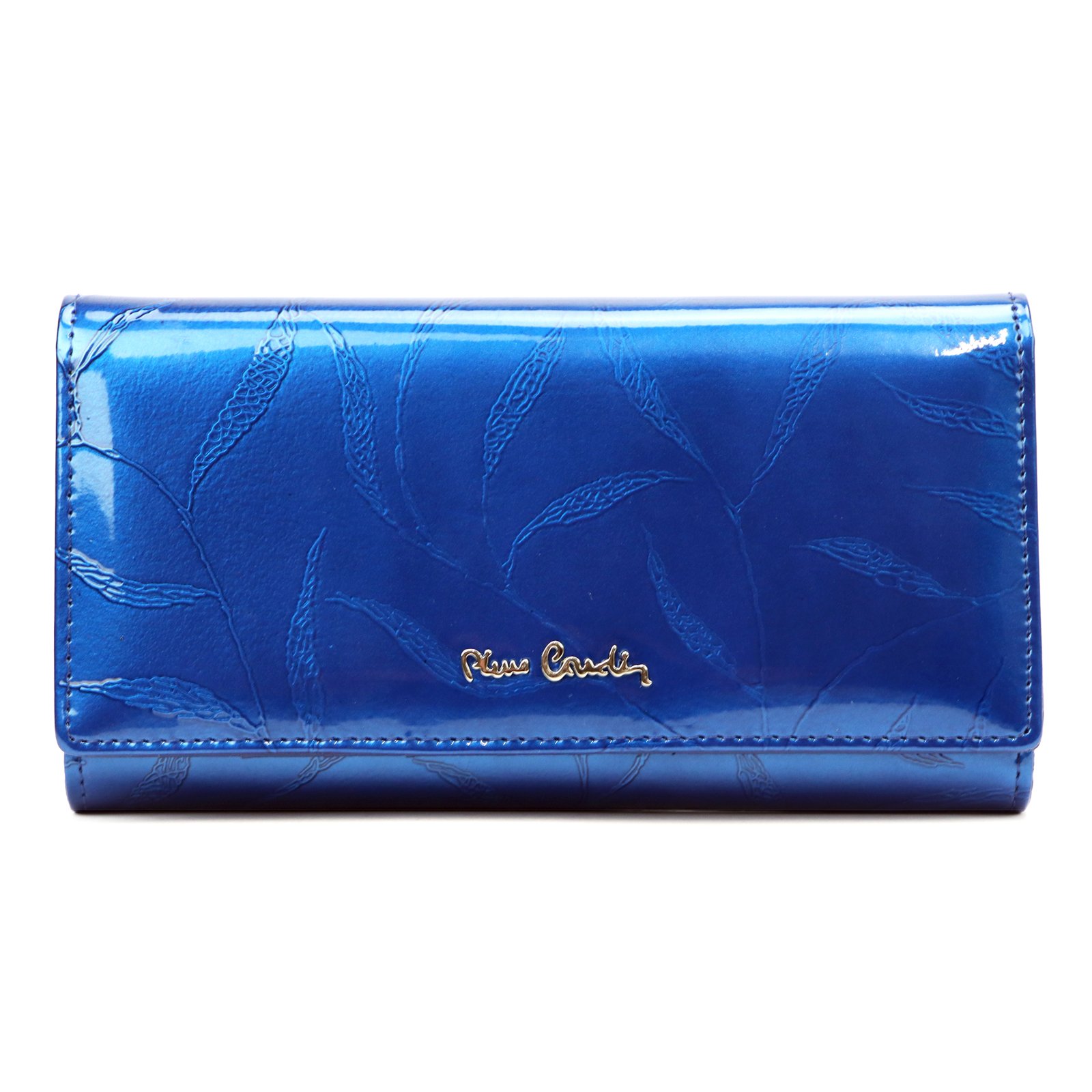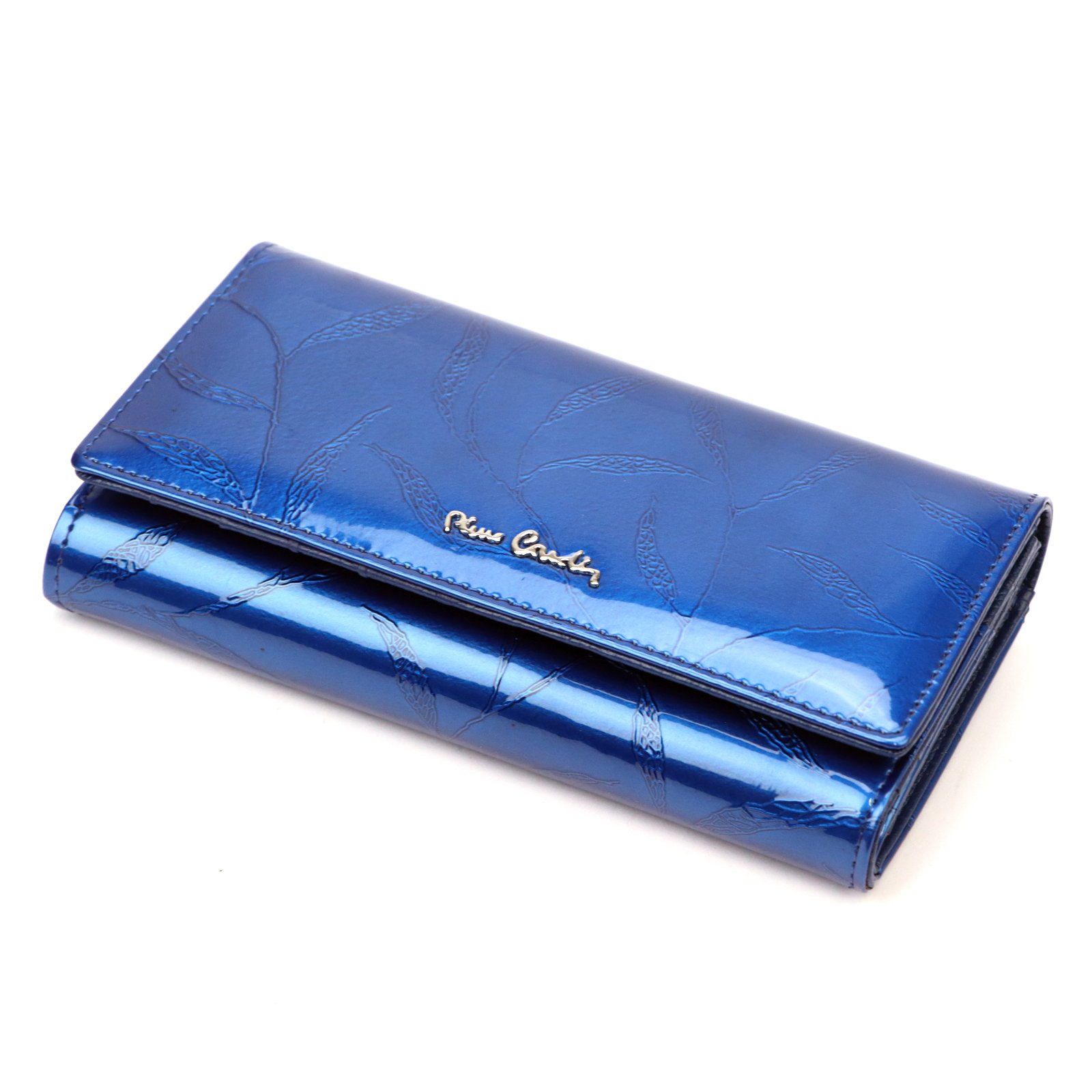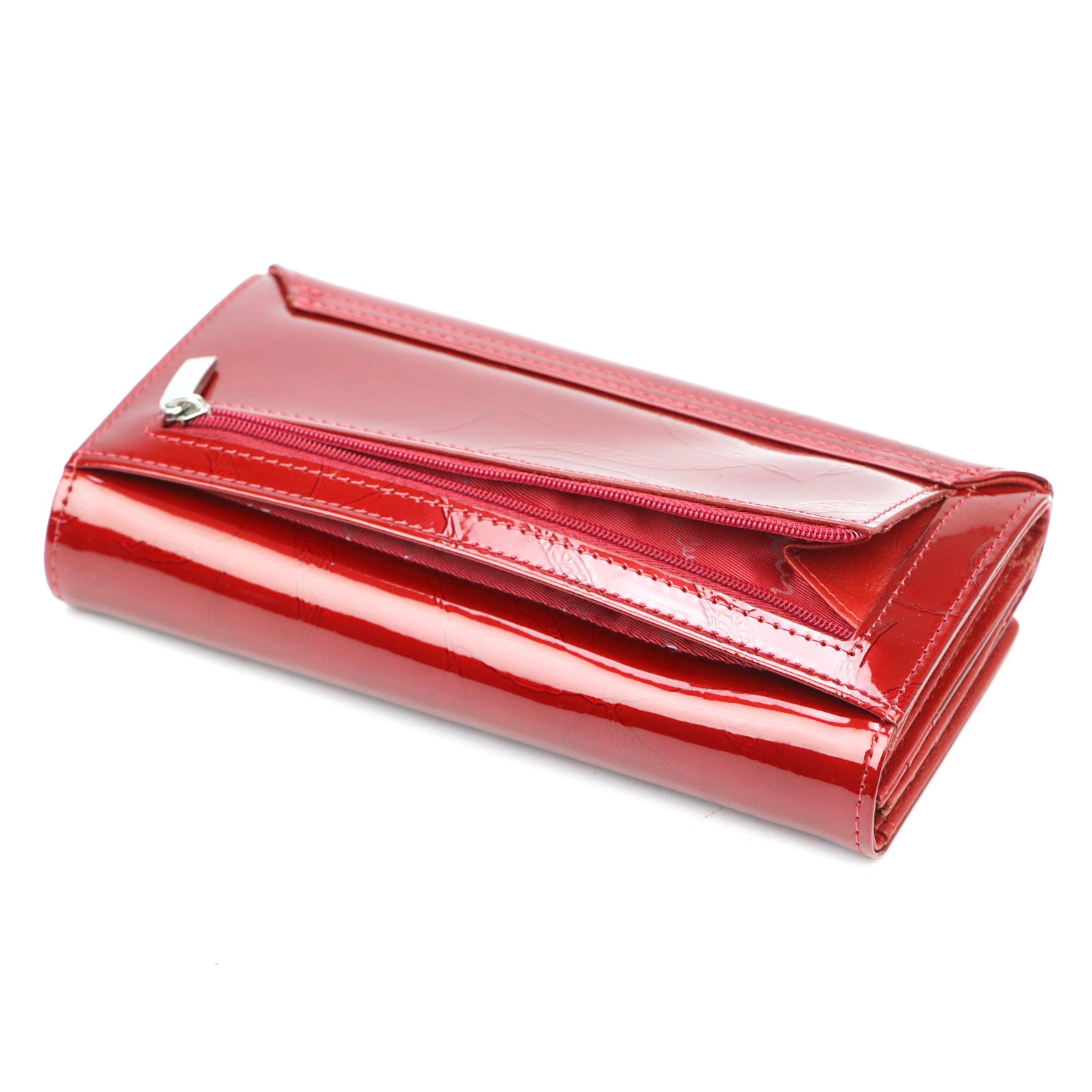 Duży portfel damski, wykonany z najwyższej jakości naturalnej, włoskiej skóry licowej lakierowanej, z wytłoczonym, delikatnym motywem liści.
