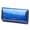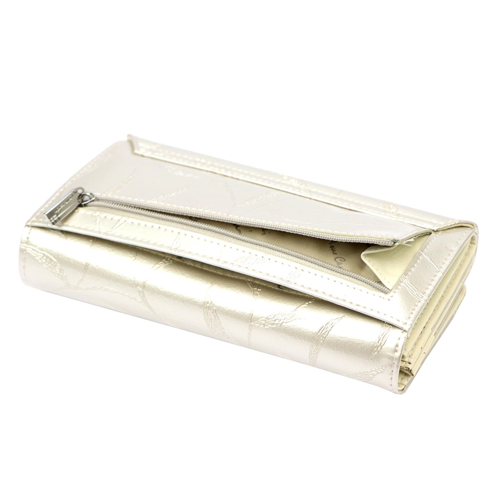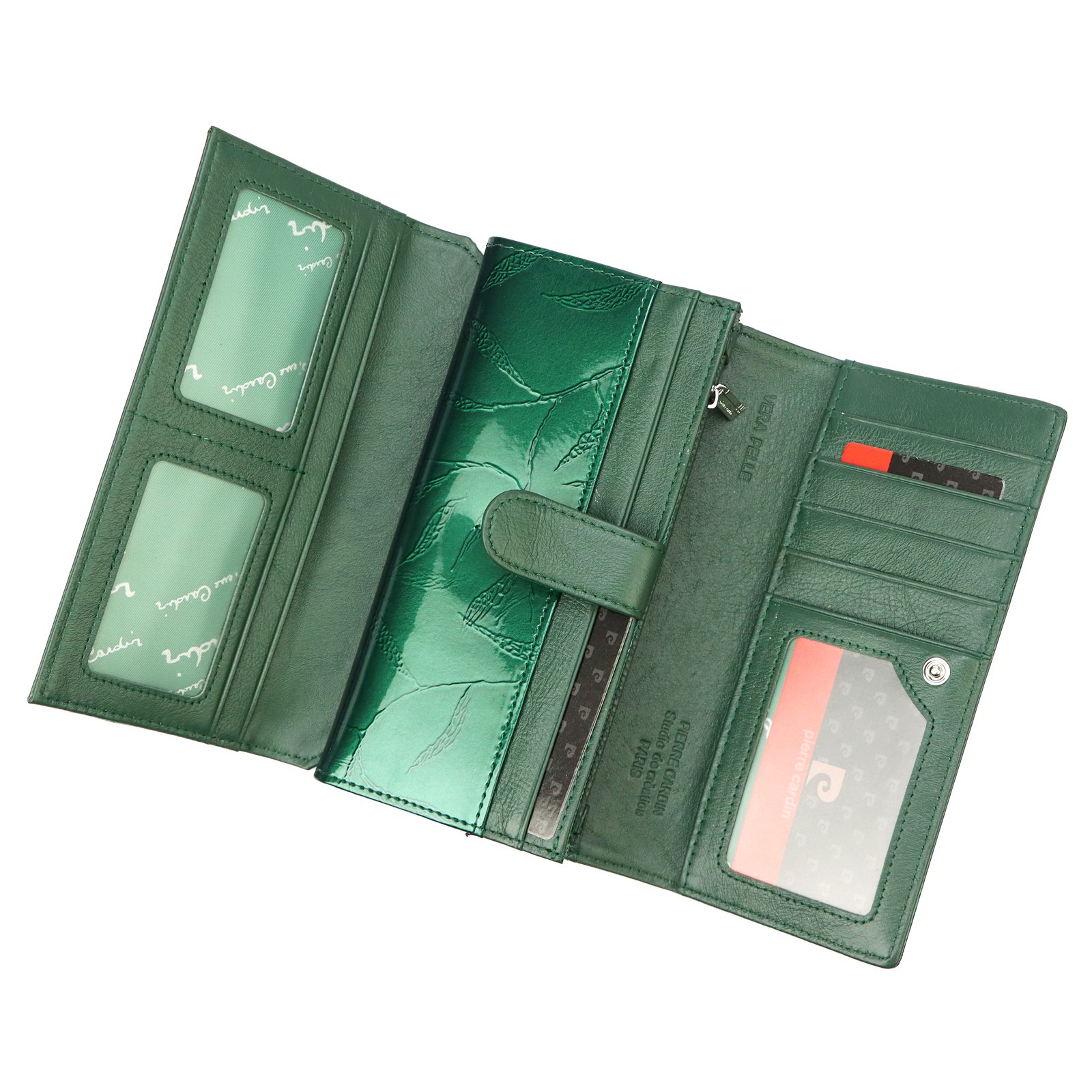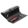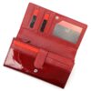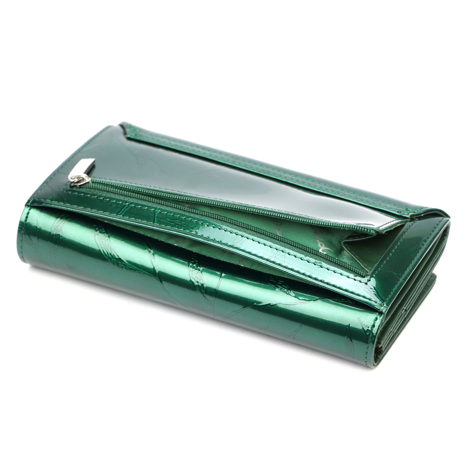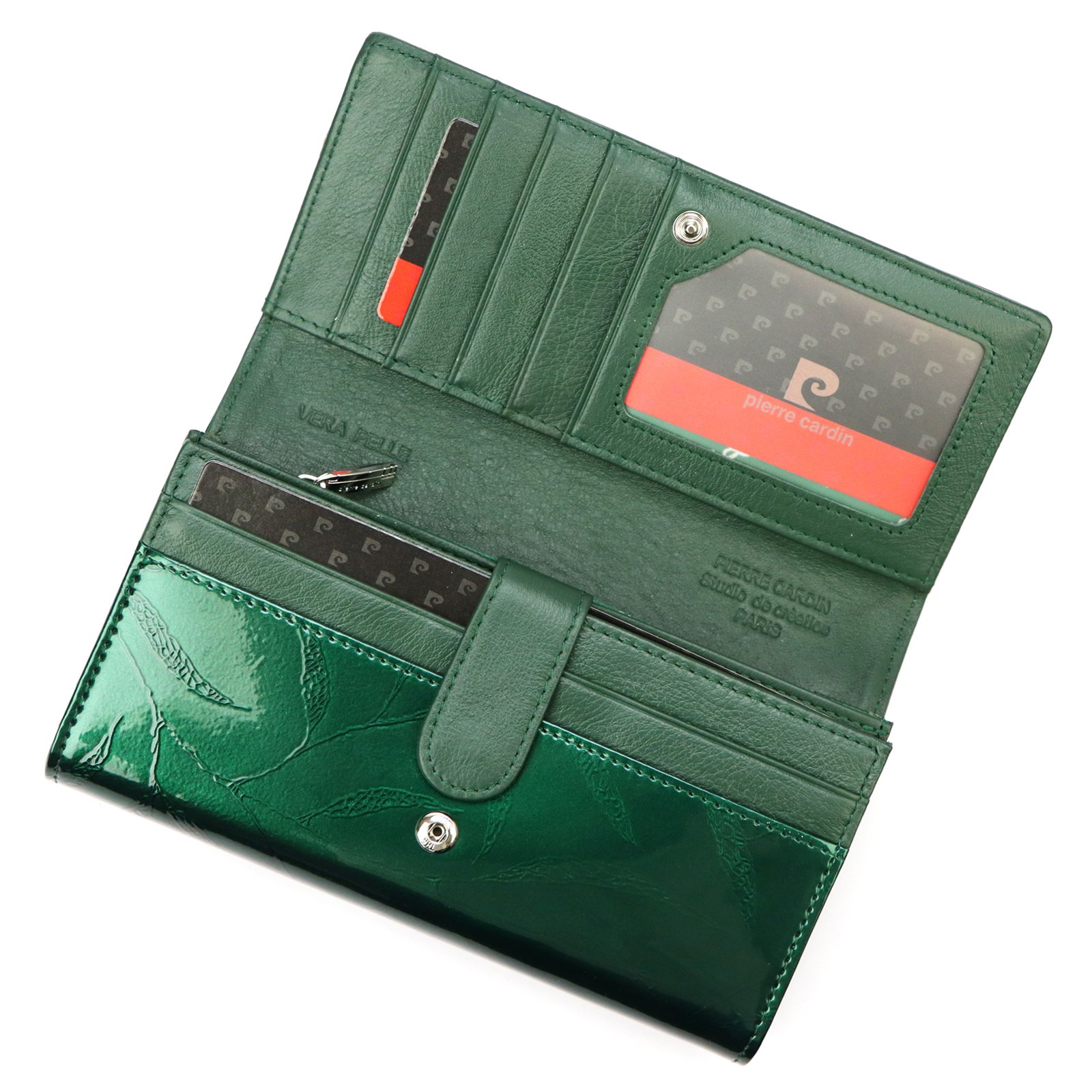 Duży portfel damski, wykonany z najwyższej jakości naturalnej, włoskiej skóry licowej lakierowanej, z wytłoczonym, delikatnym motywem liści.