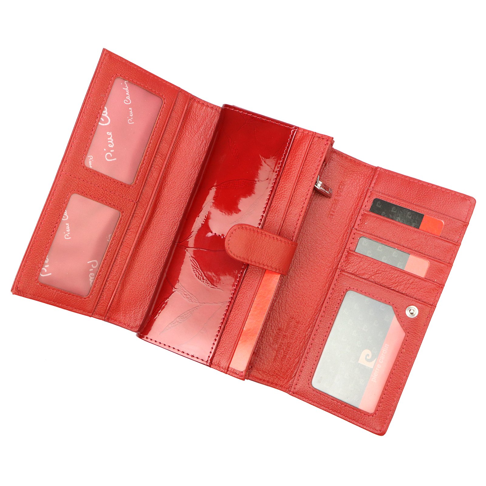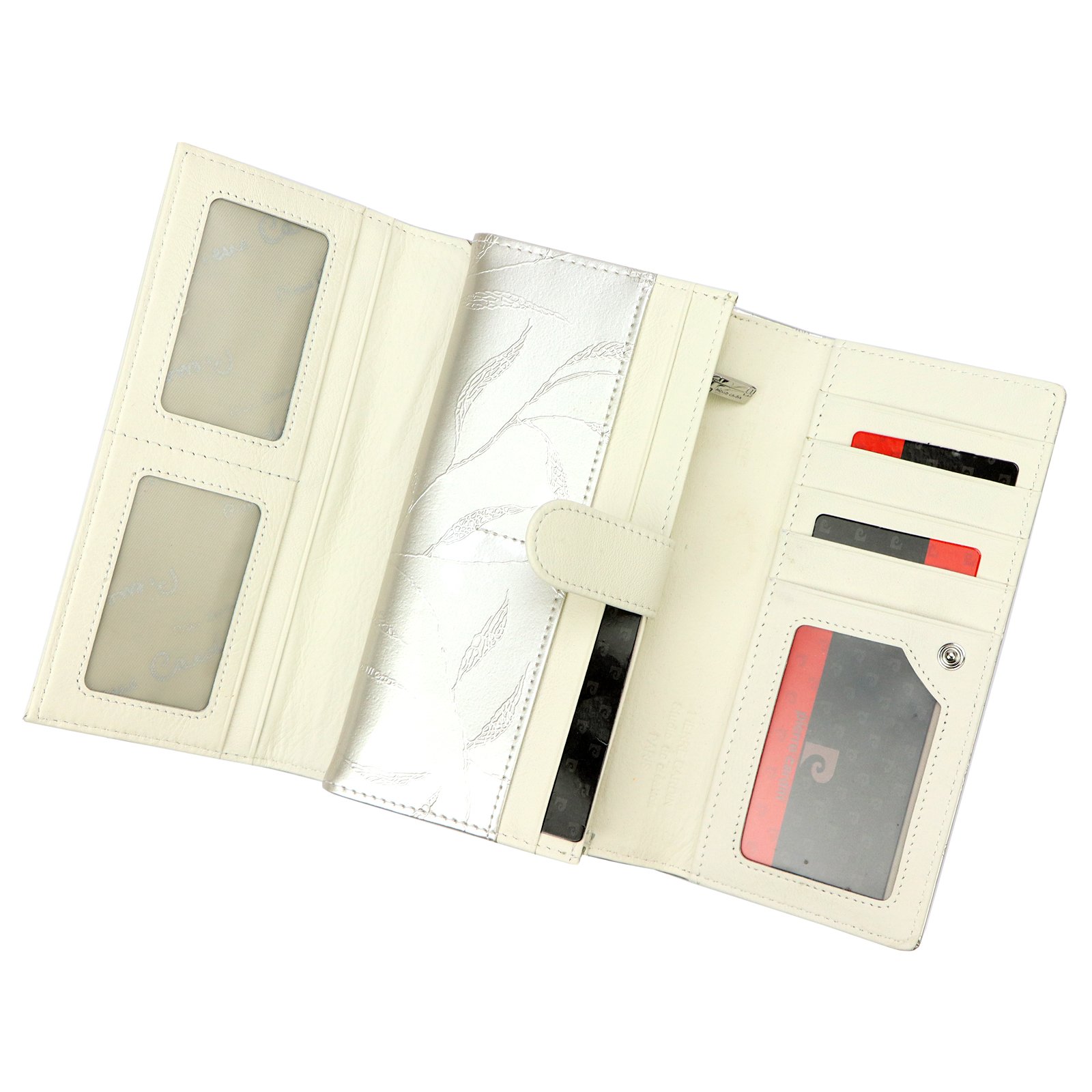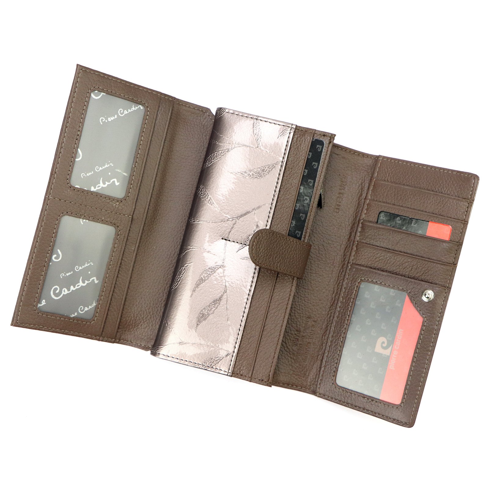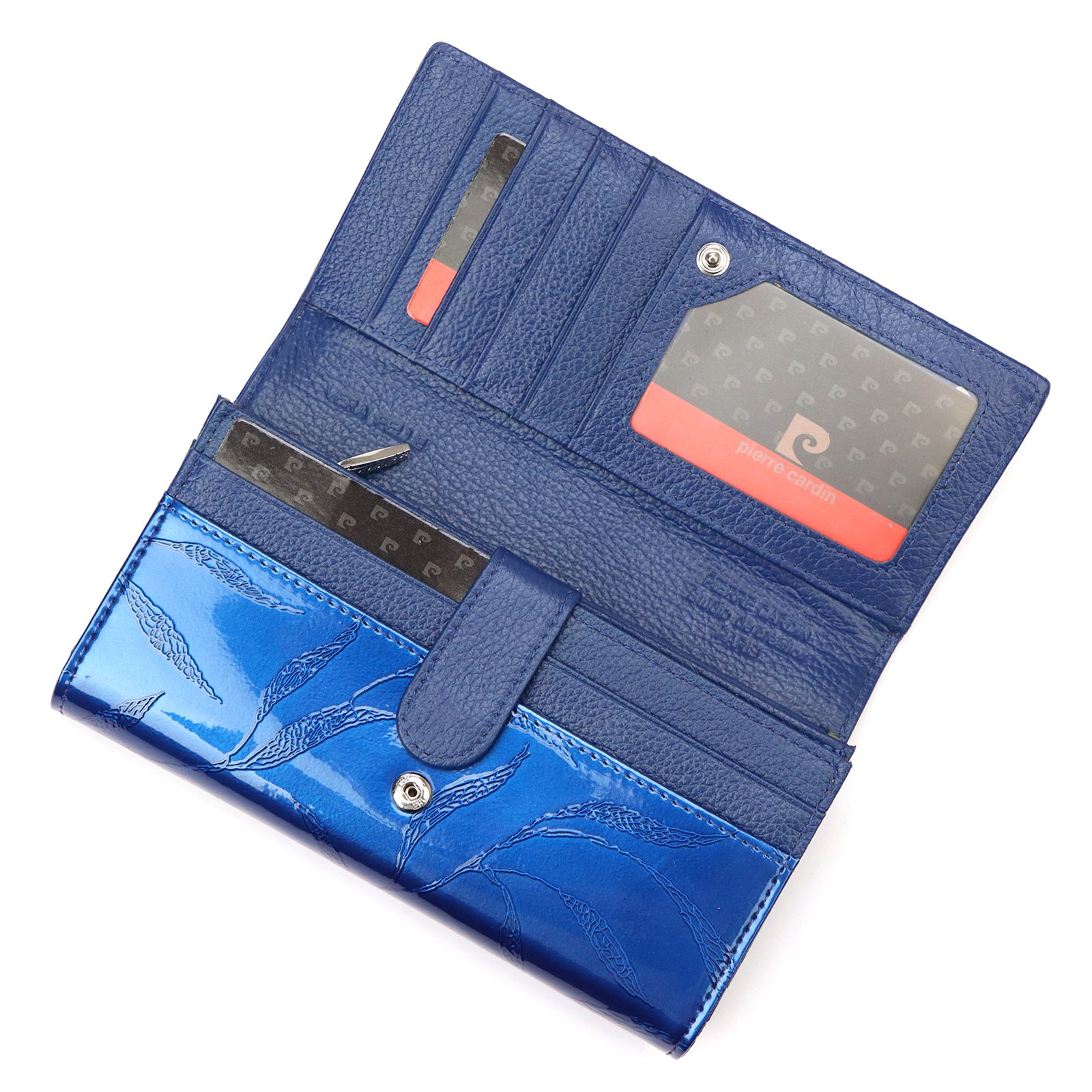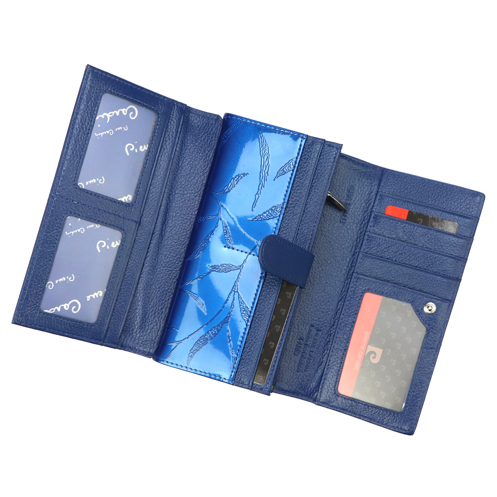 Duży portfel damski, wykonany z najwyższej jakości naturalnej, włoskiej skóry licowej lakierowanej, z wytłoczonym, delikatnym motywem liści.