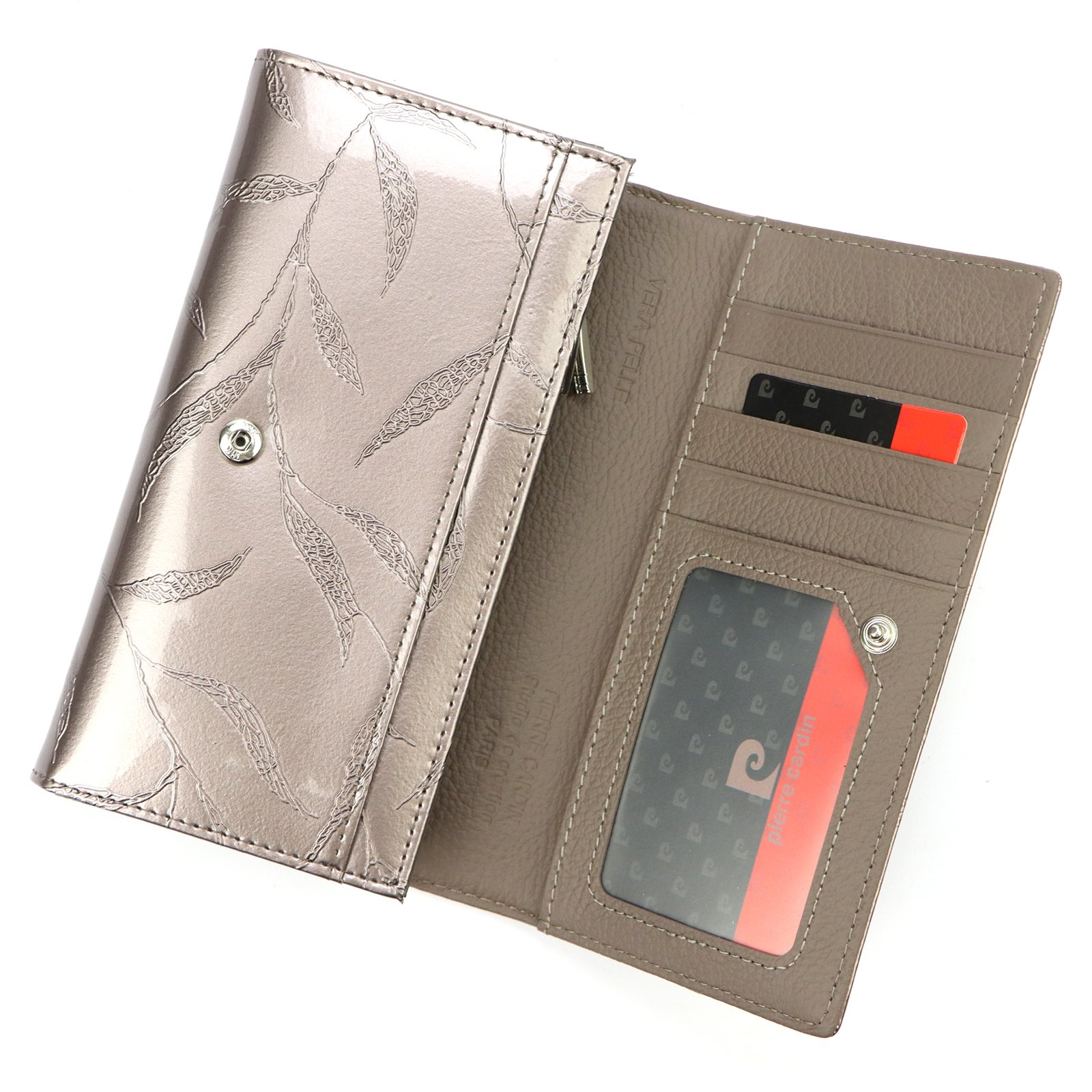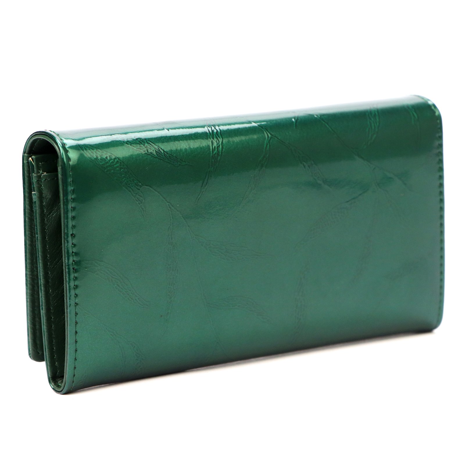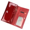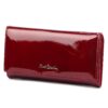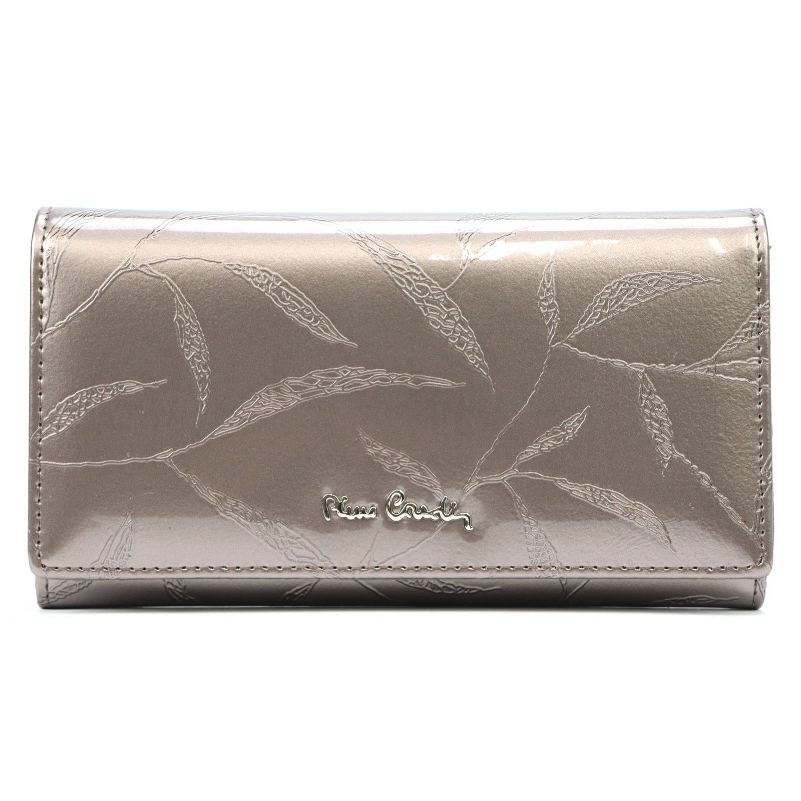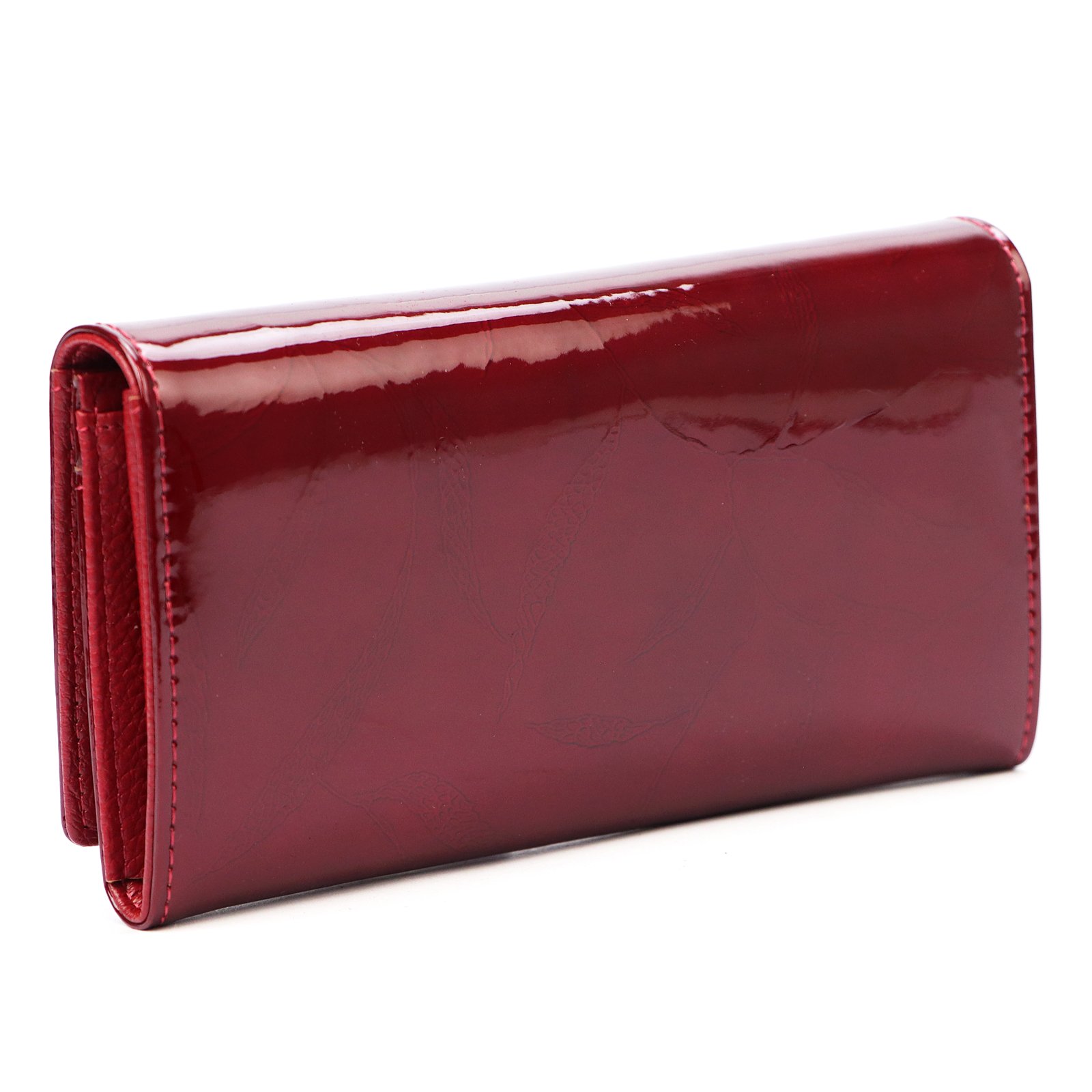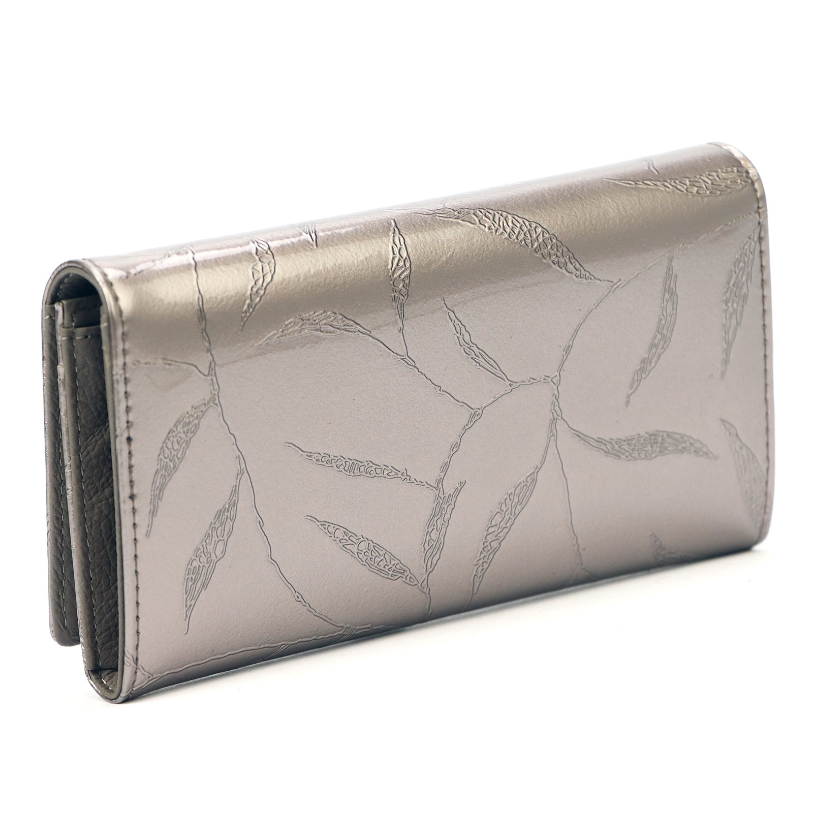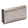 Duży portfel damski, wykonany z najwyższej jakości naturalnej, włoskiej skóry licowej lakierowanej, z wytłoczonym, delikatnym motywem liści.