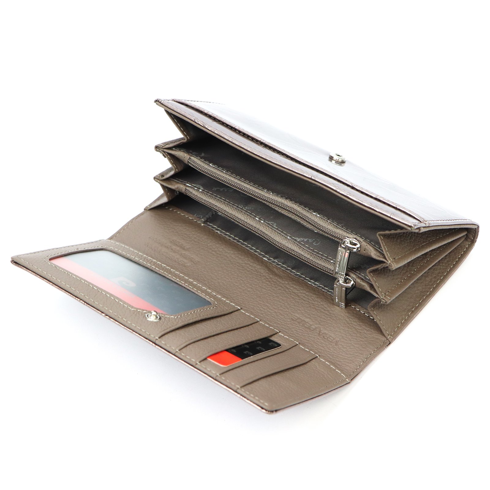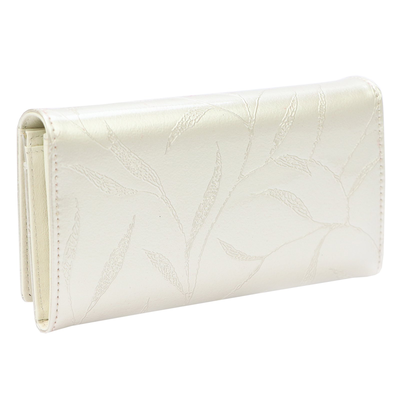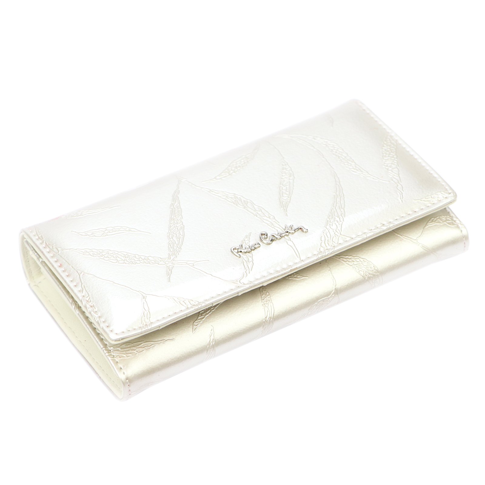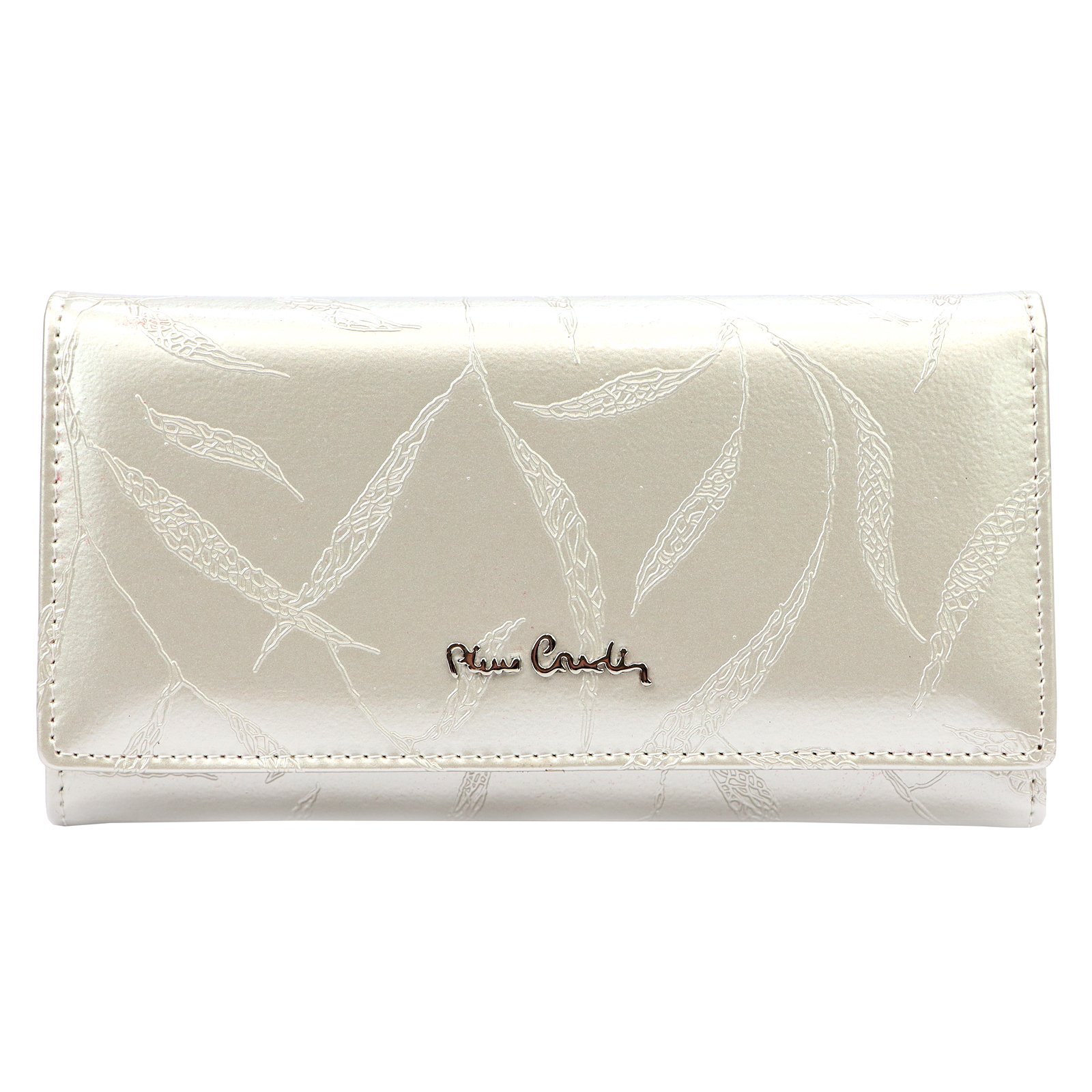 Duży portfel damski, wykonany z najwyższej jakości naturalnej, włoskiej skóry licowej lakierowanej, z wytłoczonym, delikatnym motywem liści.