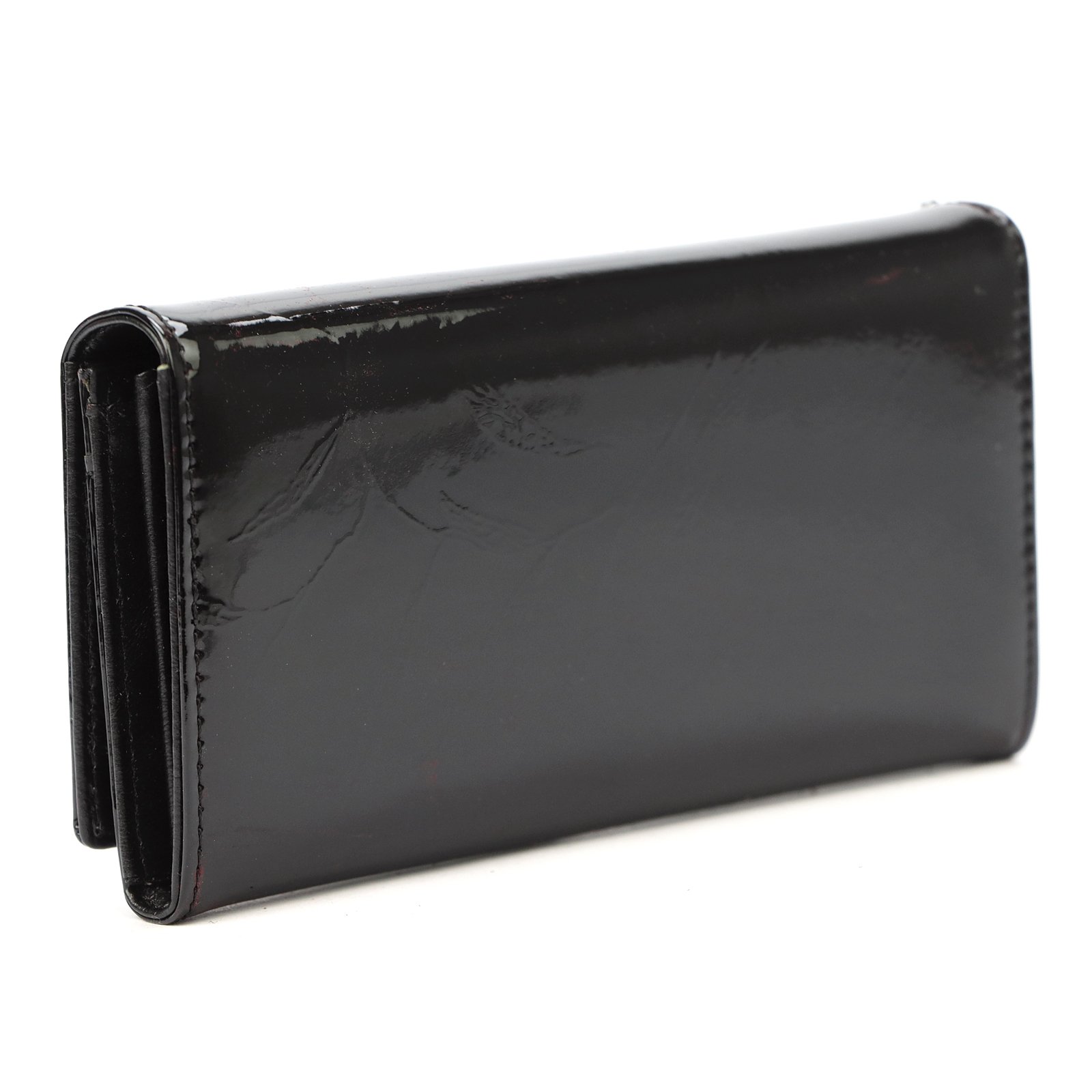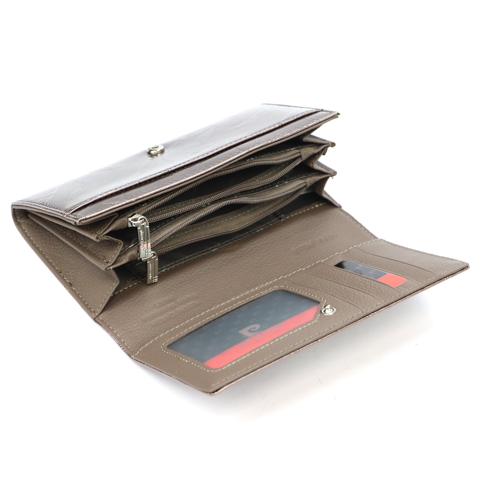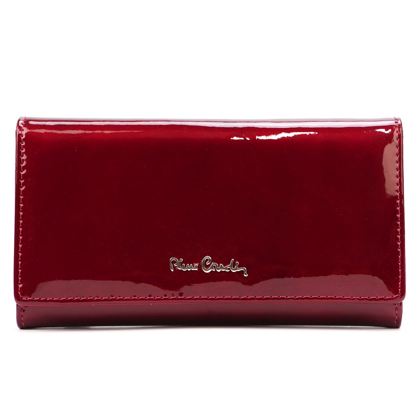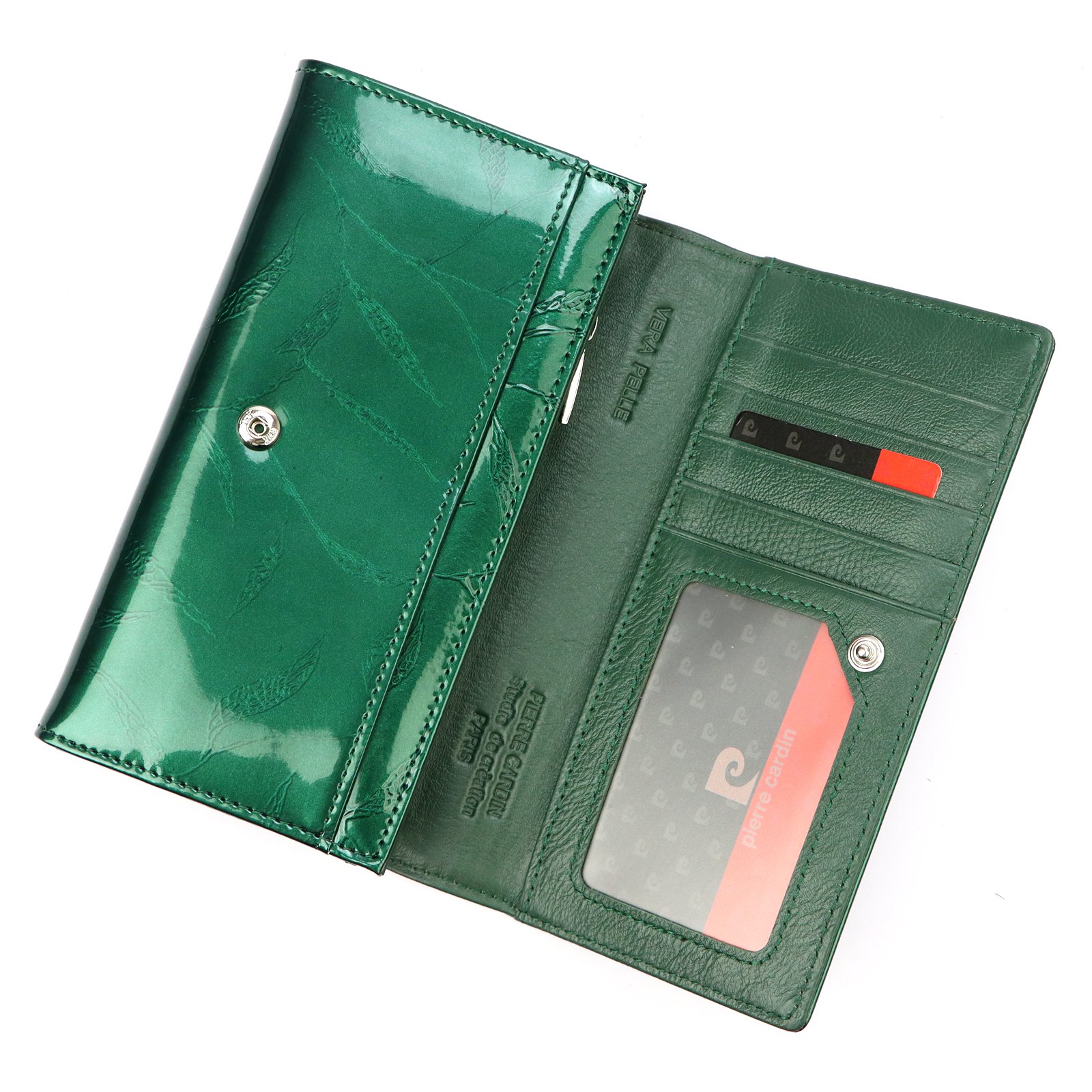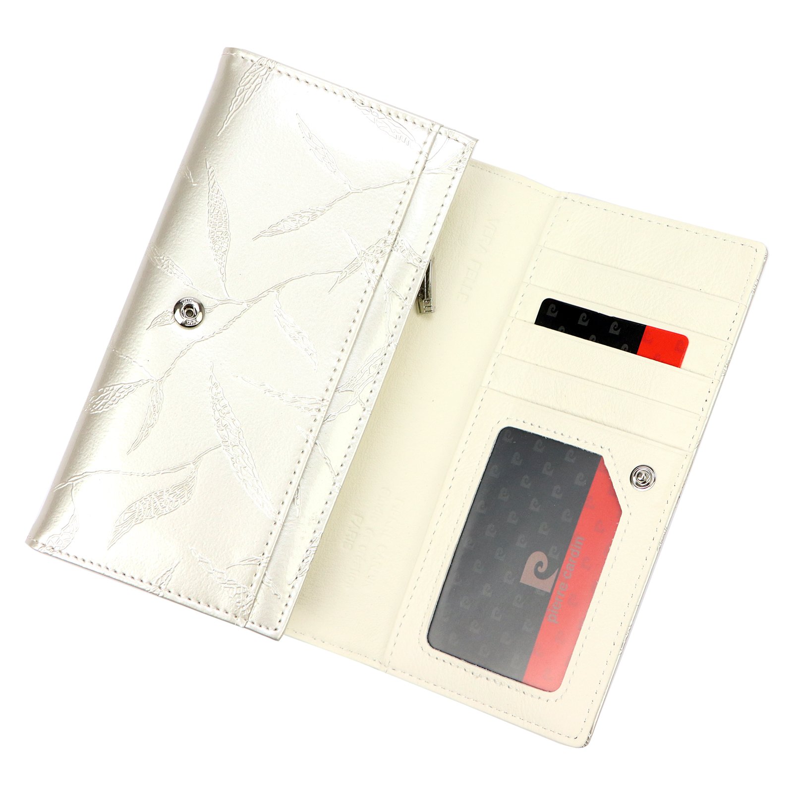 Duży portfel damski, wykonany z najwyższej jakości naturalnej, włoskiej skóry licowej lakierowanej, z wytłoczonym, delikatnym motywem liści.