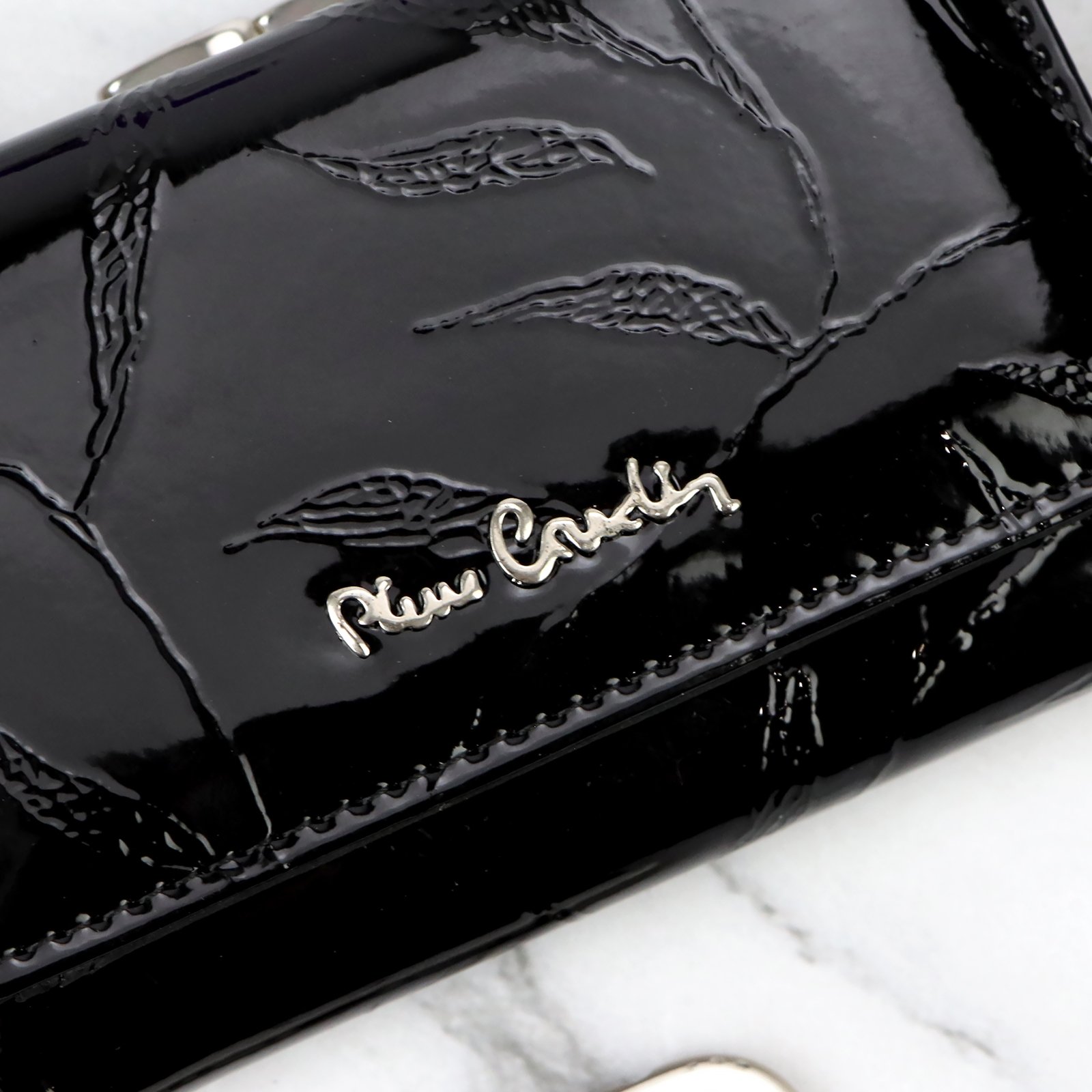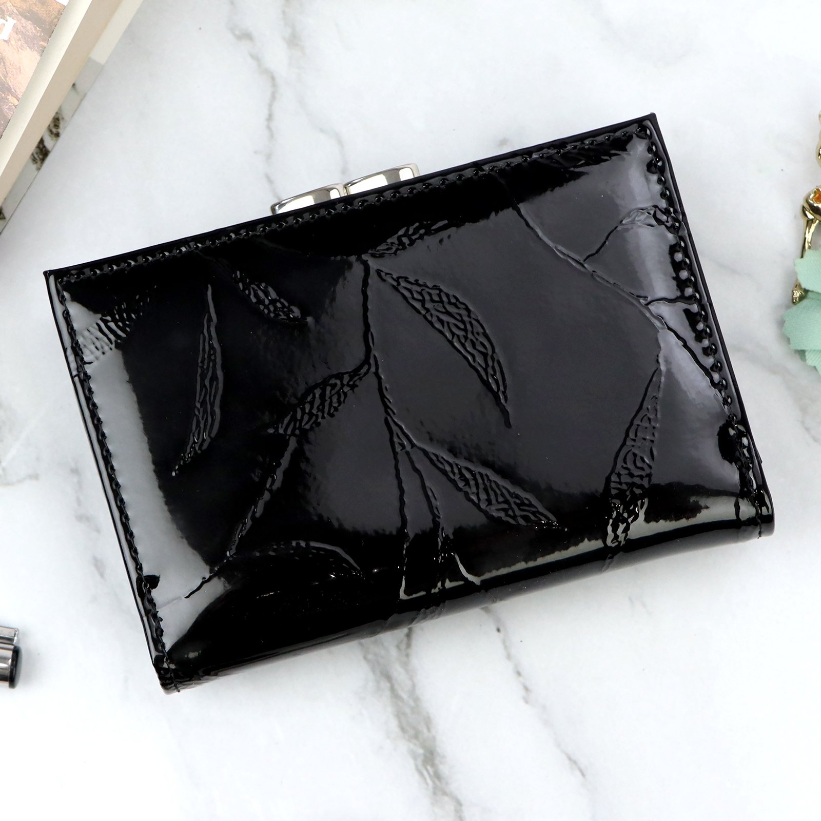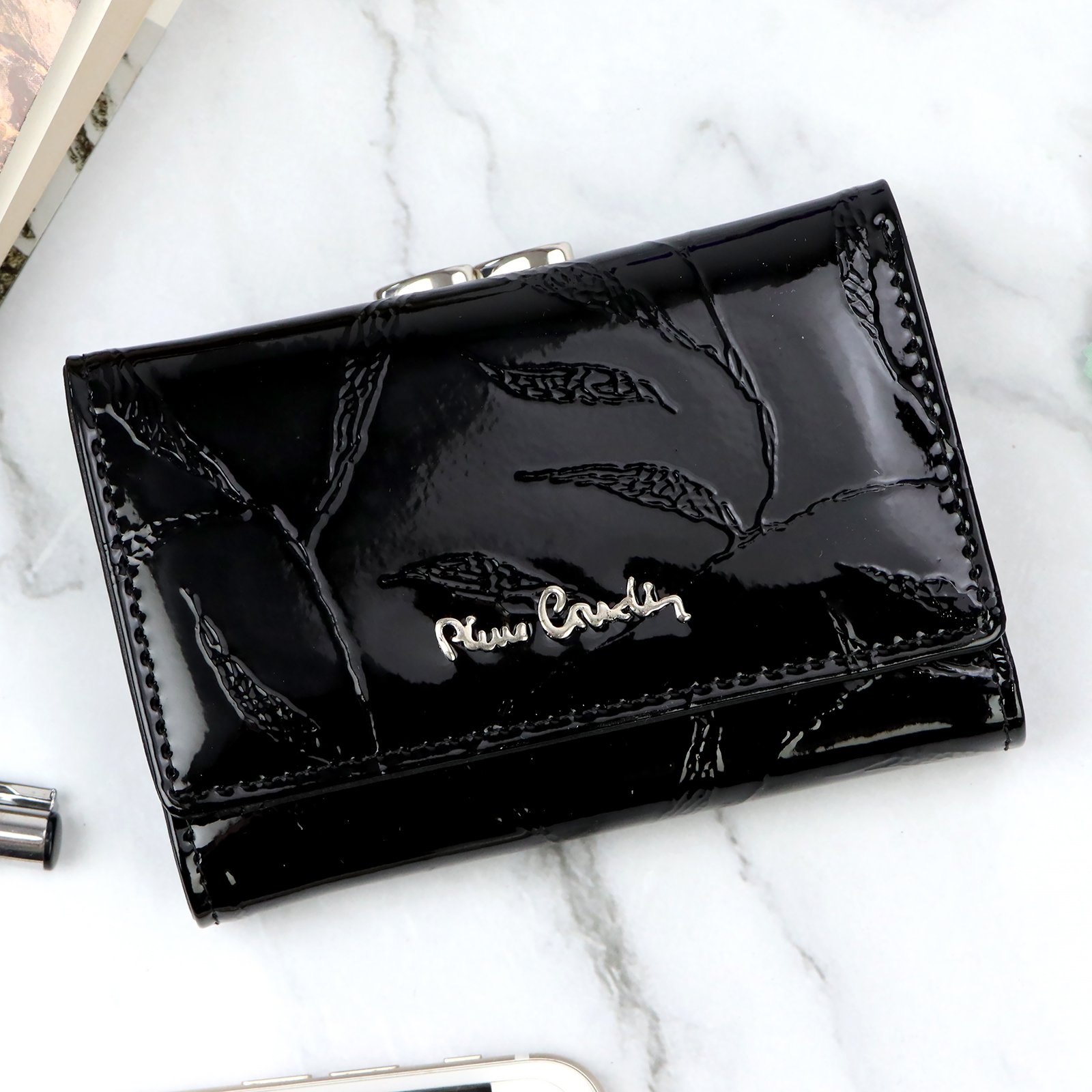 Nieduży portfel damski, wykonany z najwyższej jakości naturalnej, włoskiej skóry licowej lakierowanej, z wytłoczonym, delikatnym motywem liści.