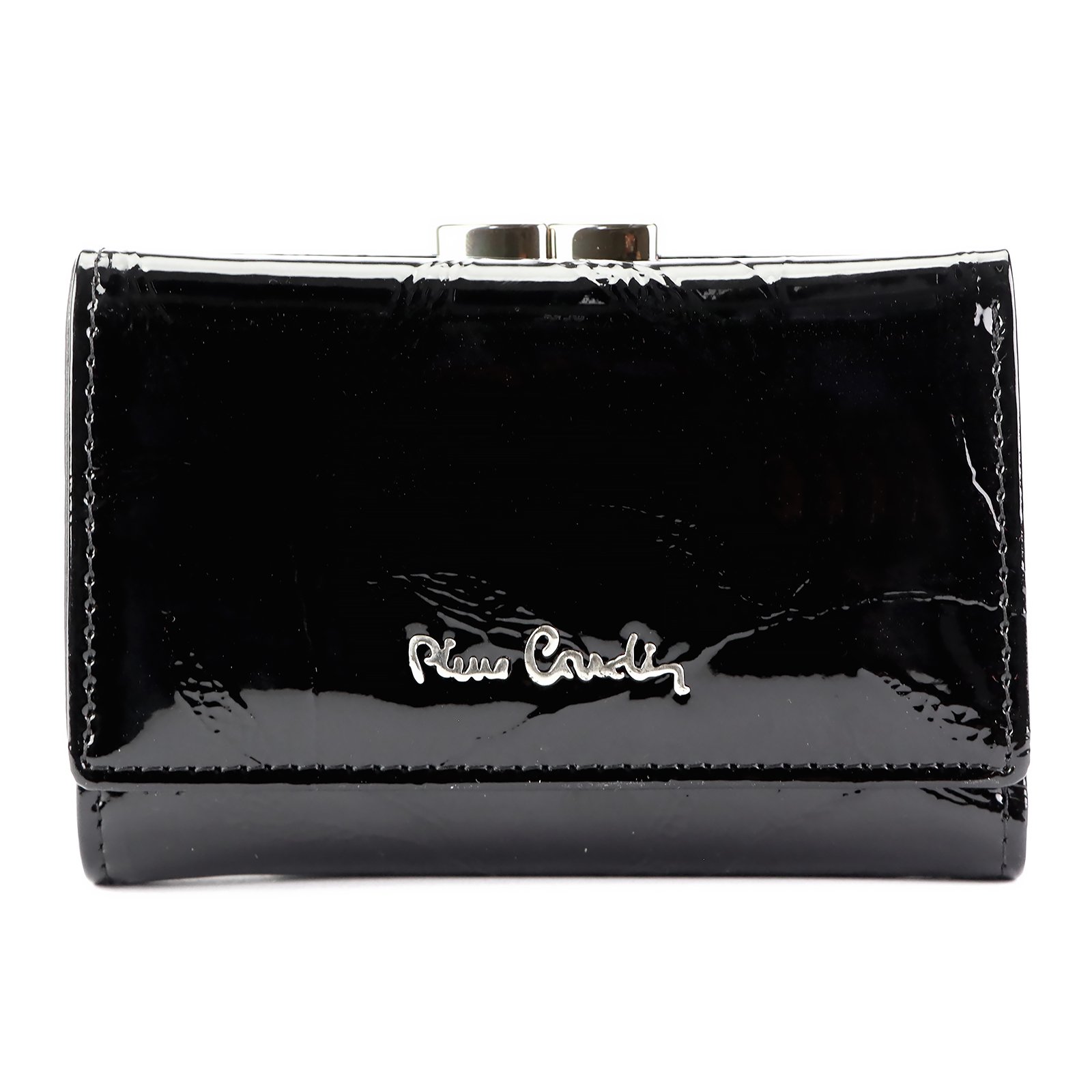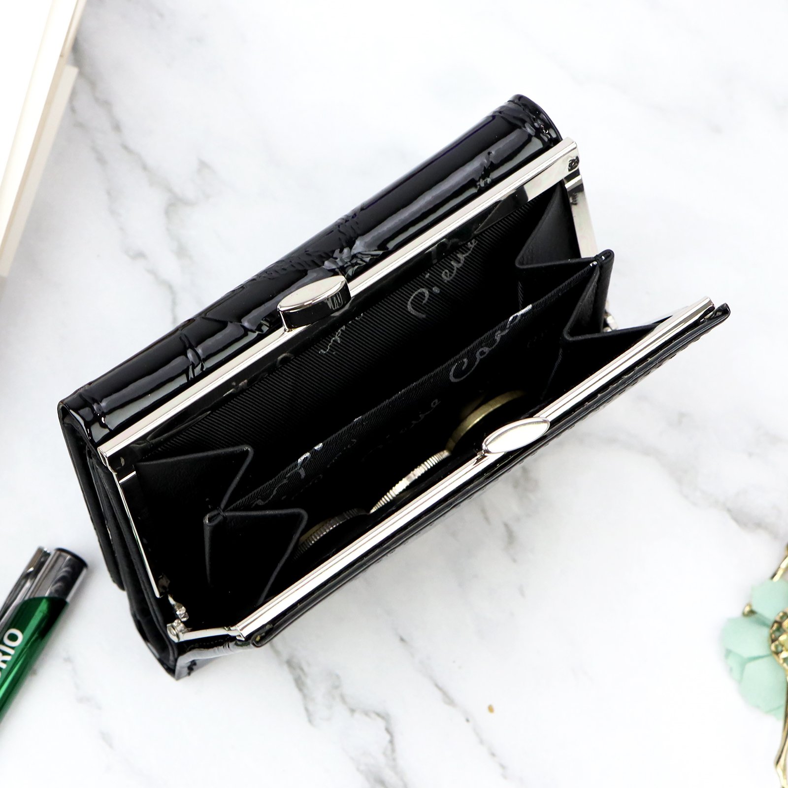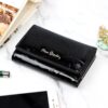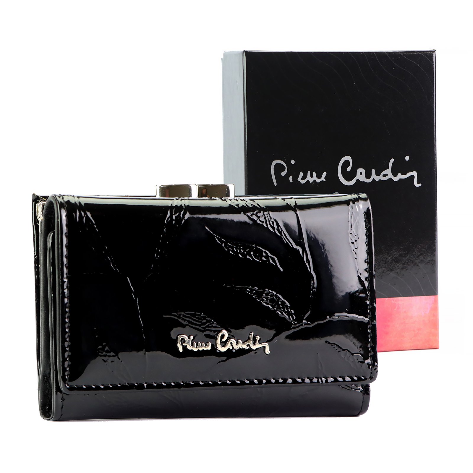 Nieduży portfel damski, wykonany z najwyższej jakości naturalnej, włoskiej skóry licowej lakierowanej, z wytłoczonym, delikatnym motywem liści.