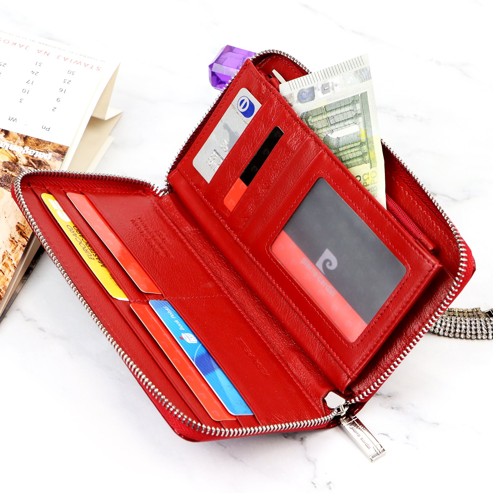 Do portfela dołączono dopinaną „rączkę”, która pozwala go nosić w ręku, jak kopertówkę.