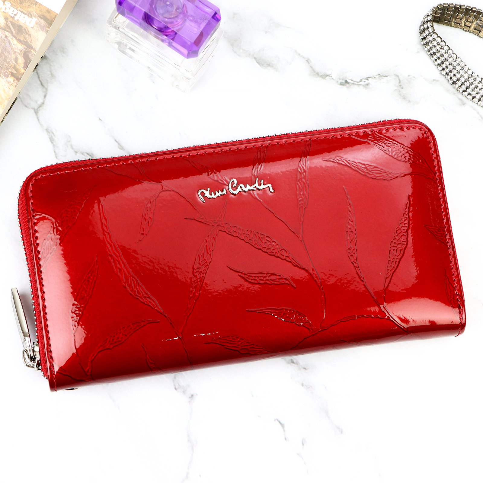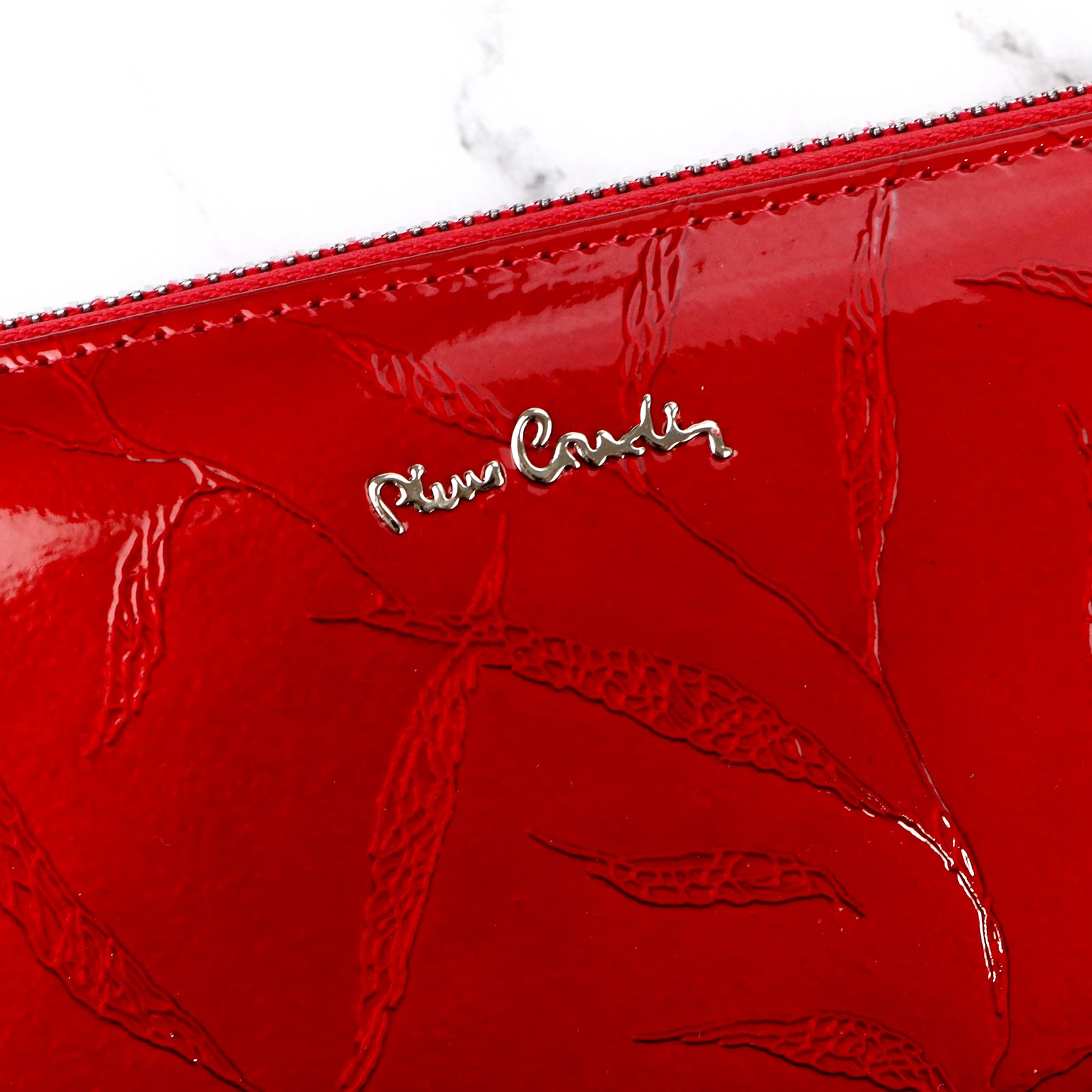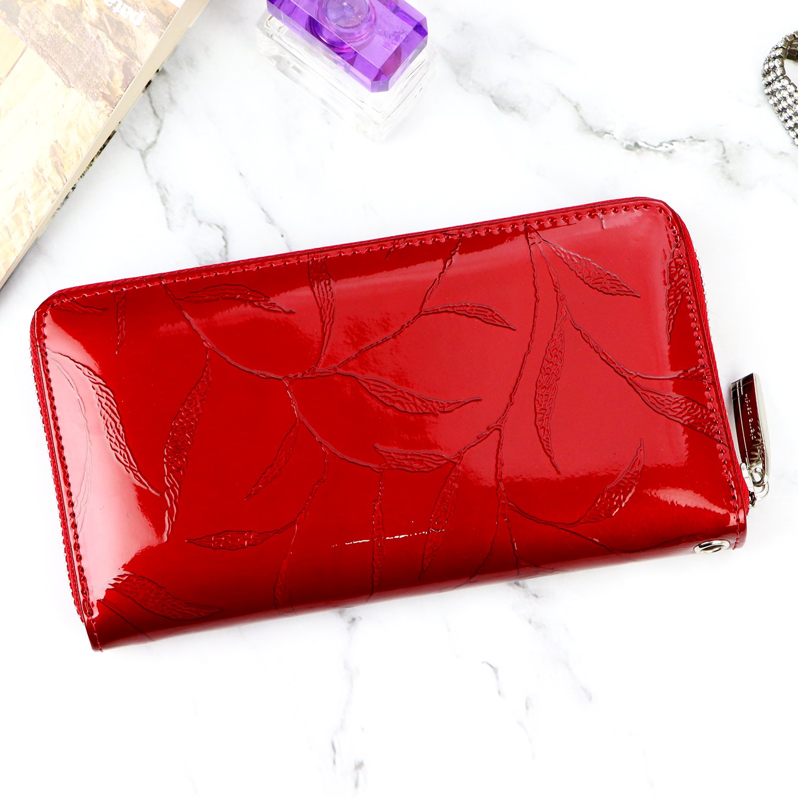 Duży portfel damski typu „piórnik”, wykonany z najwyższej jakości naturalnej, włoskiej skóry licowej lakierowanej, z wytłoczonym, delikatnym motywem liści.
