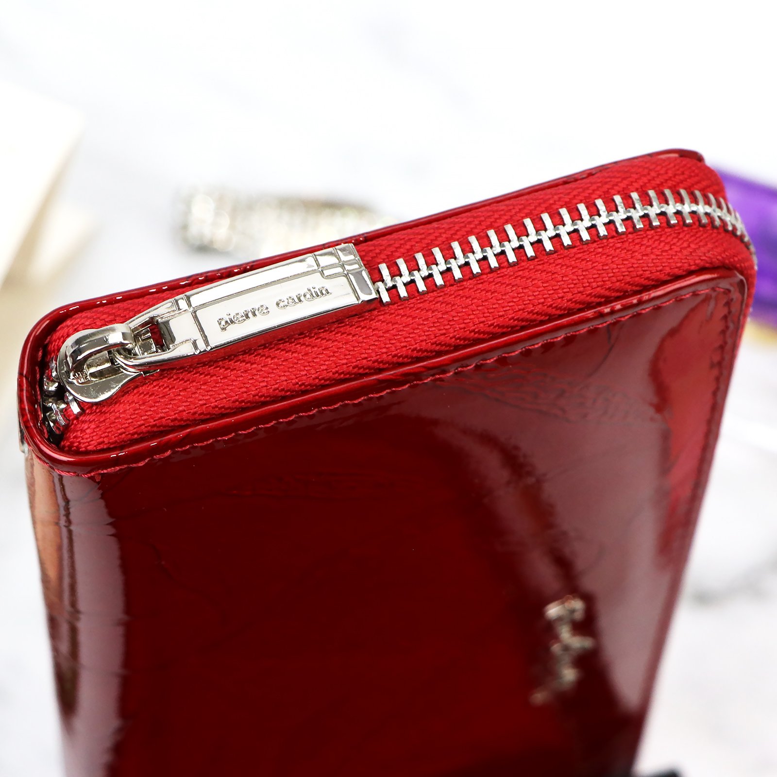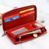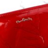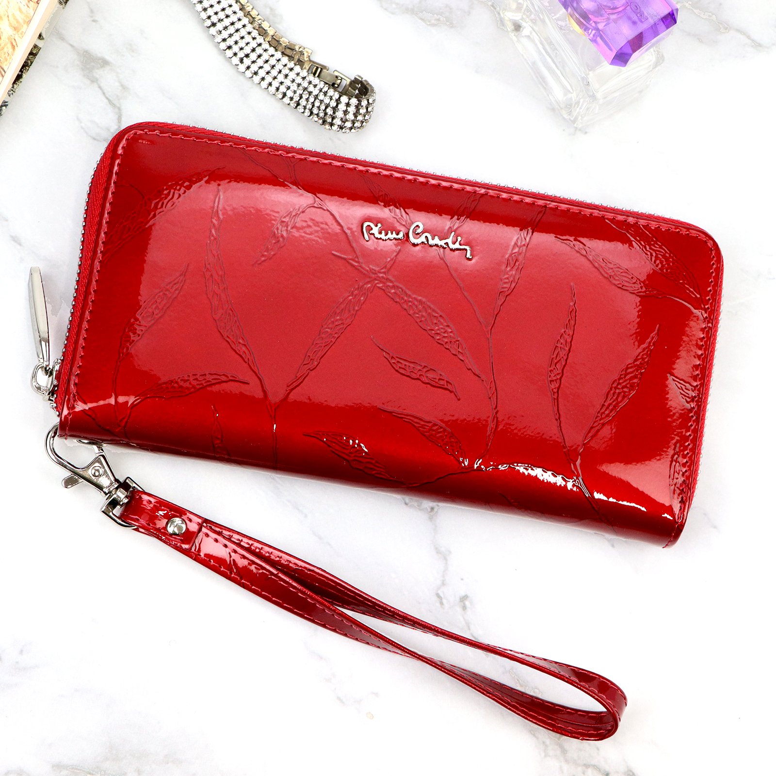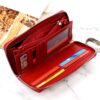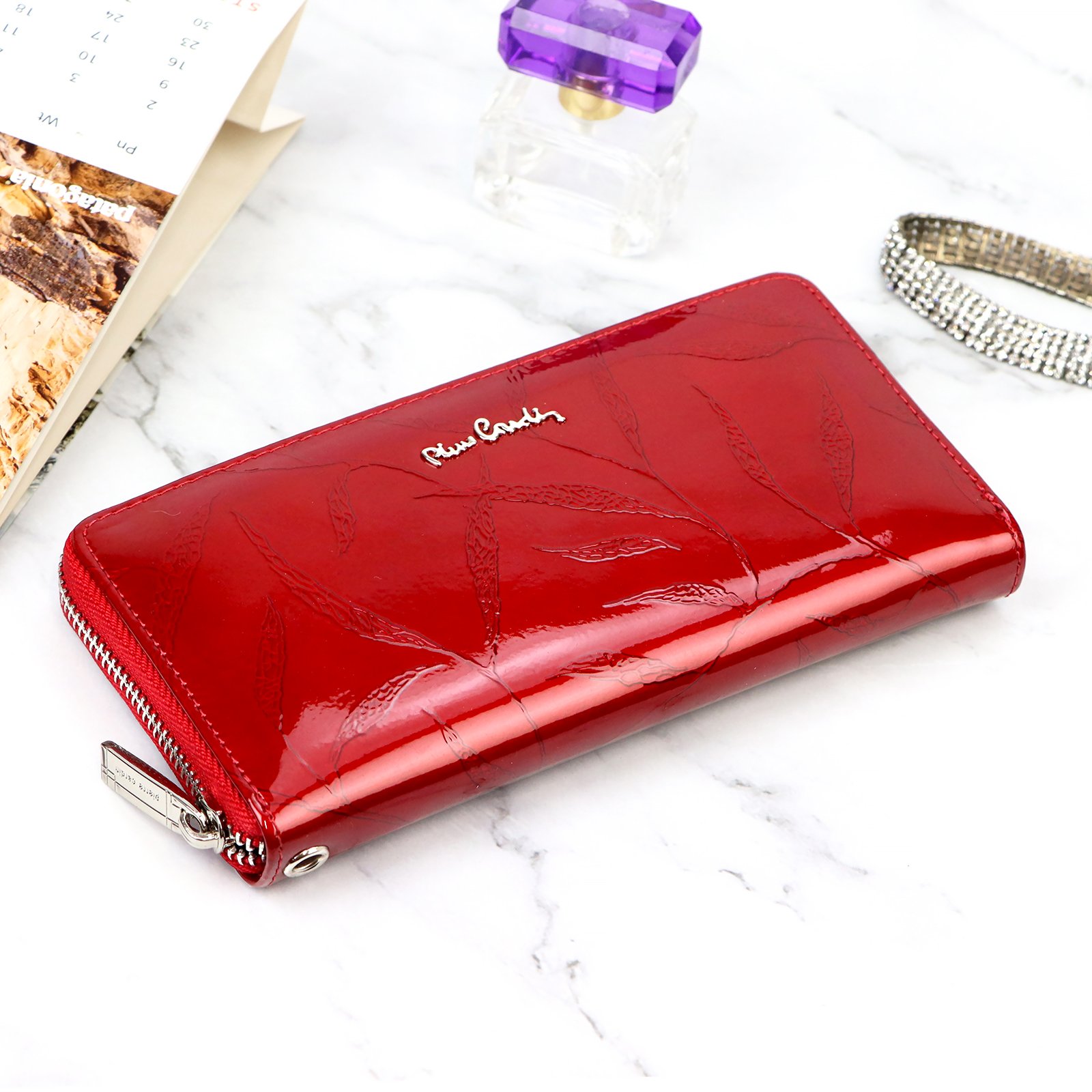 Duży portfel damski typu „piórnik”, wykonany z najwyższej jakości naturalnej, włoskiej skóry licowej lakierowanej, z wytłoczonym, delikatnym motywem liści.