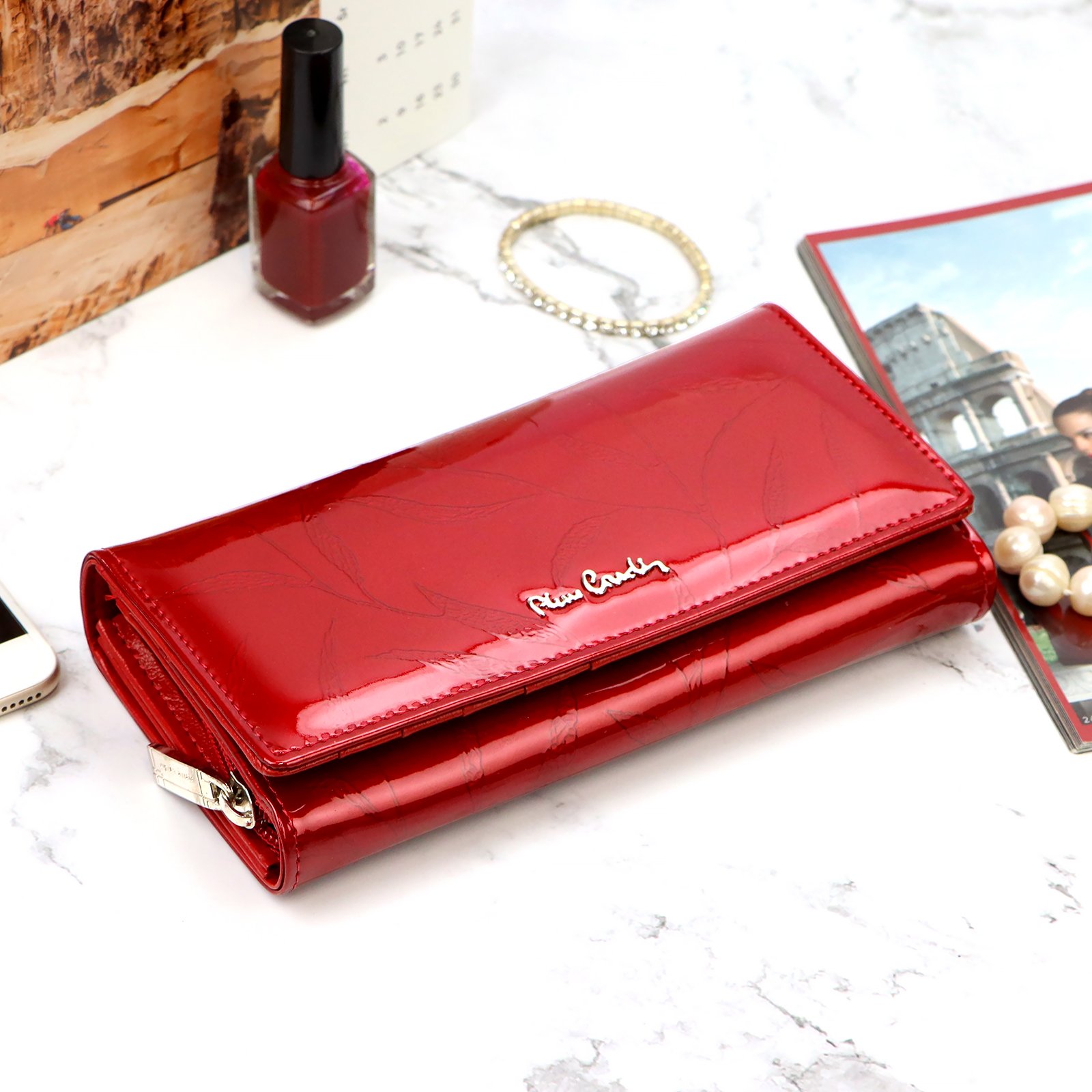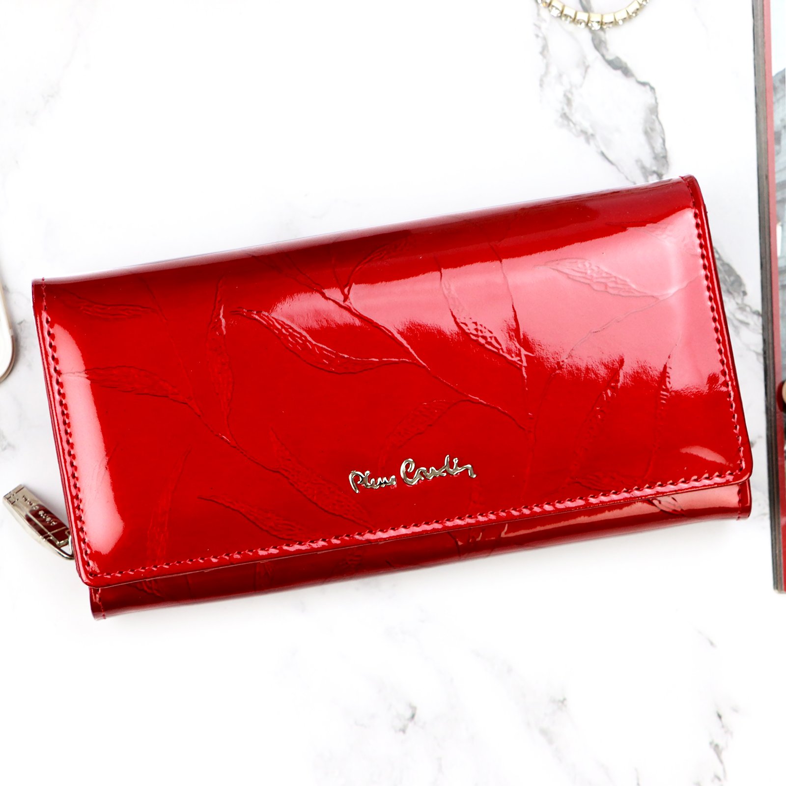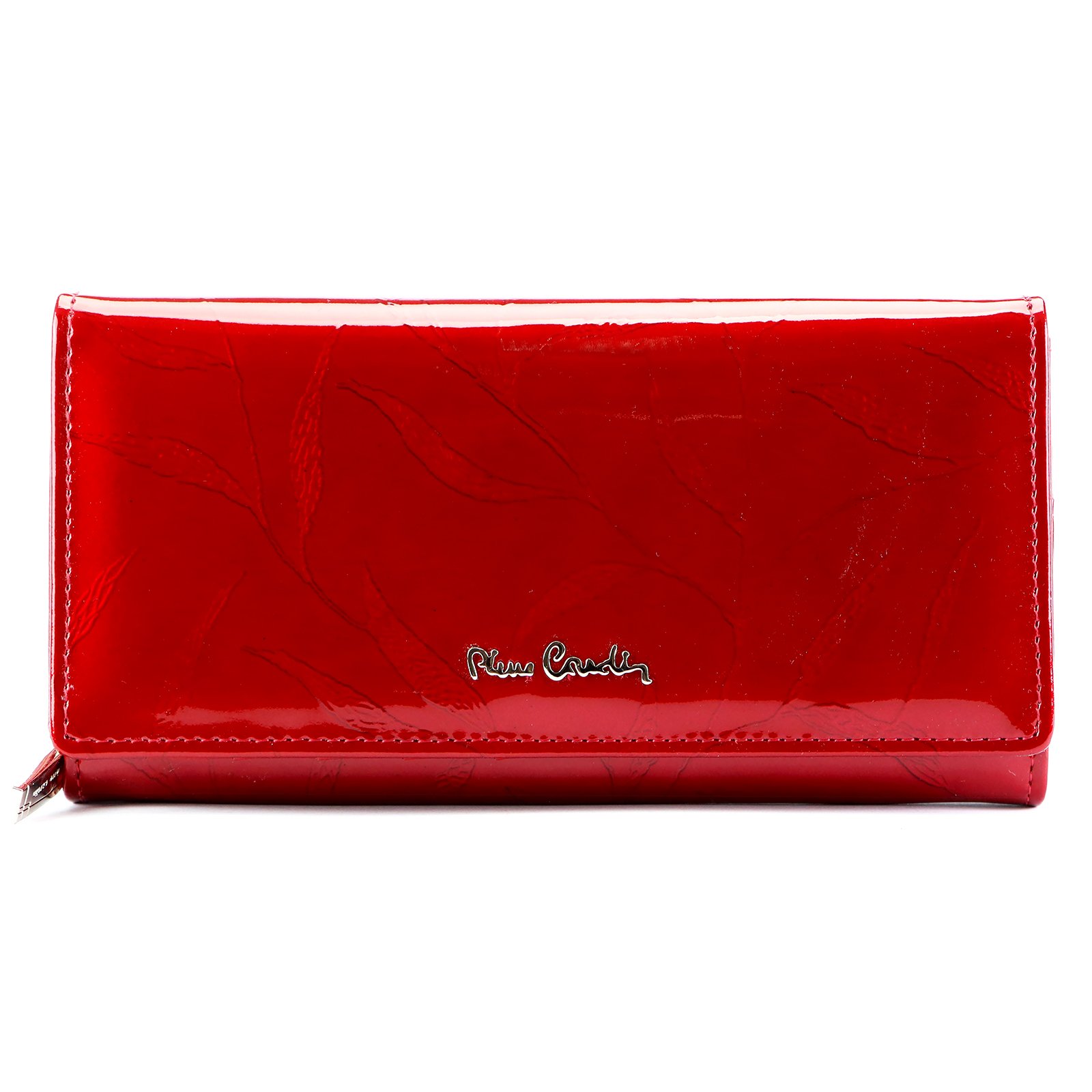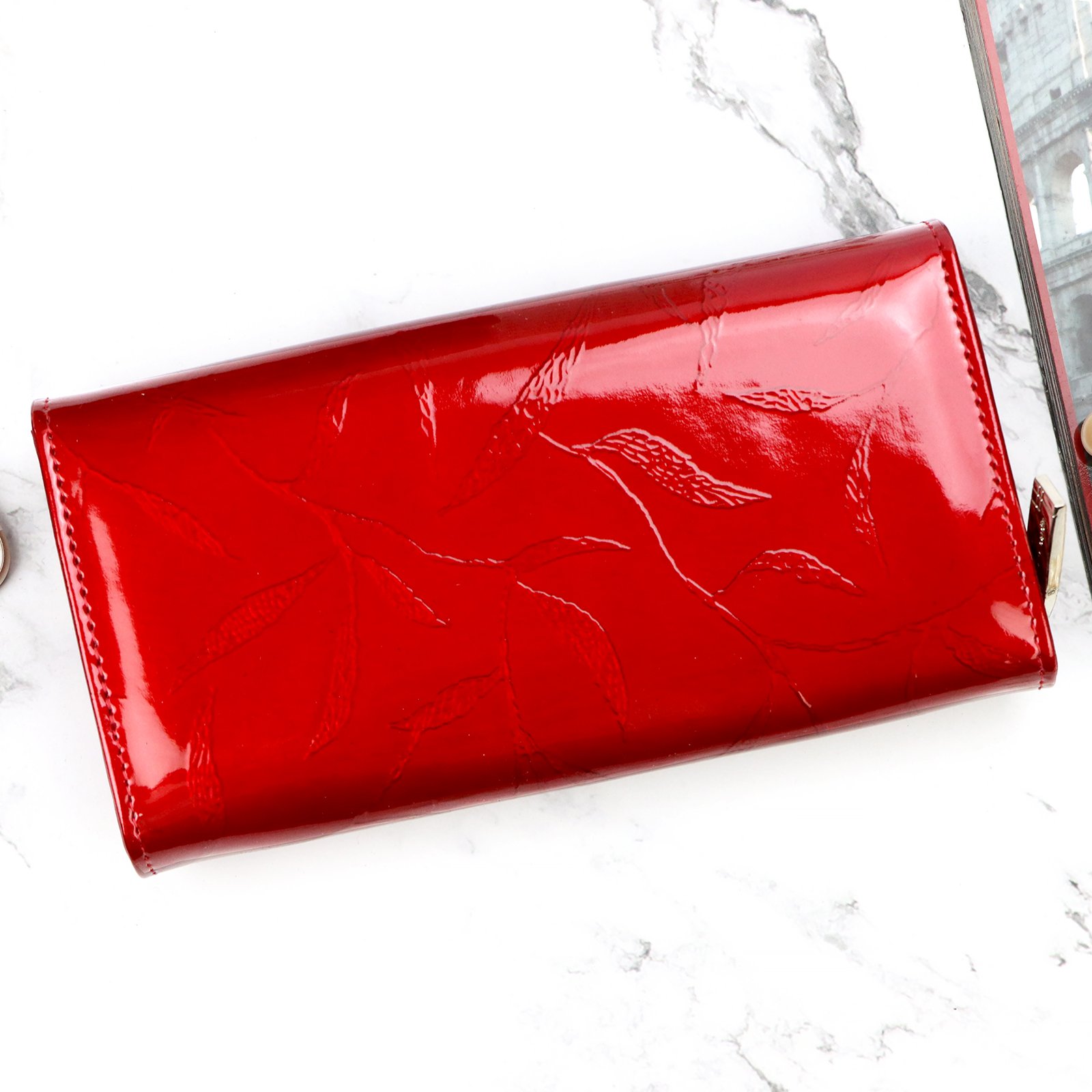 Duży portfel damski, wykonany z najwyższej jakości naturalnej, włoskiej skóry licowej lakierowanej, z wytłoczonym, delikatnym motywem liści.
