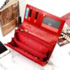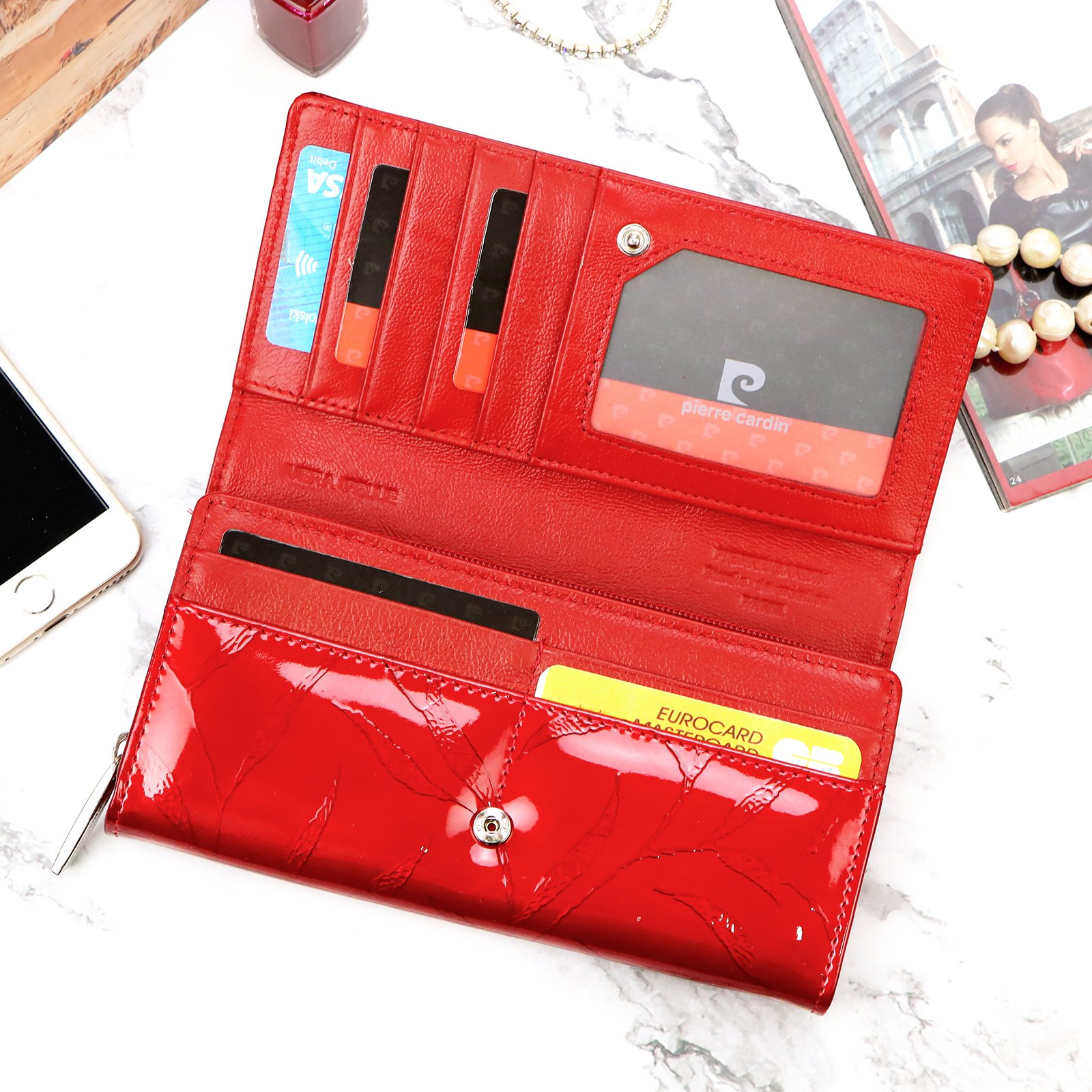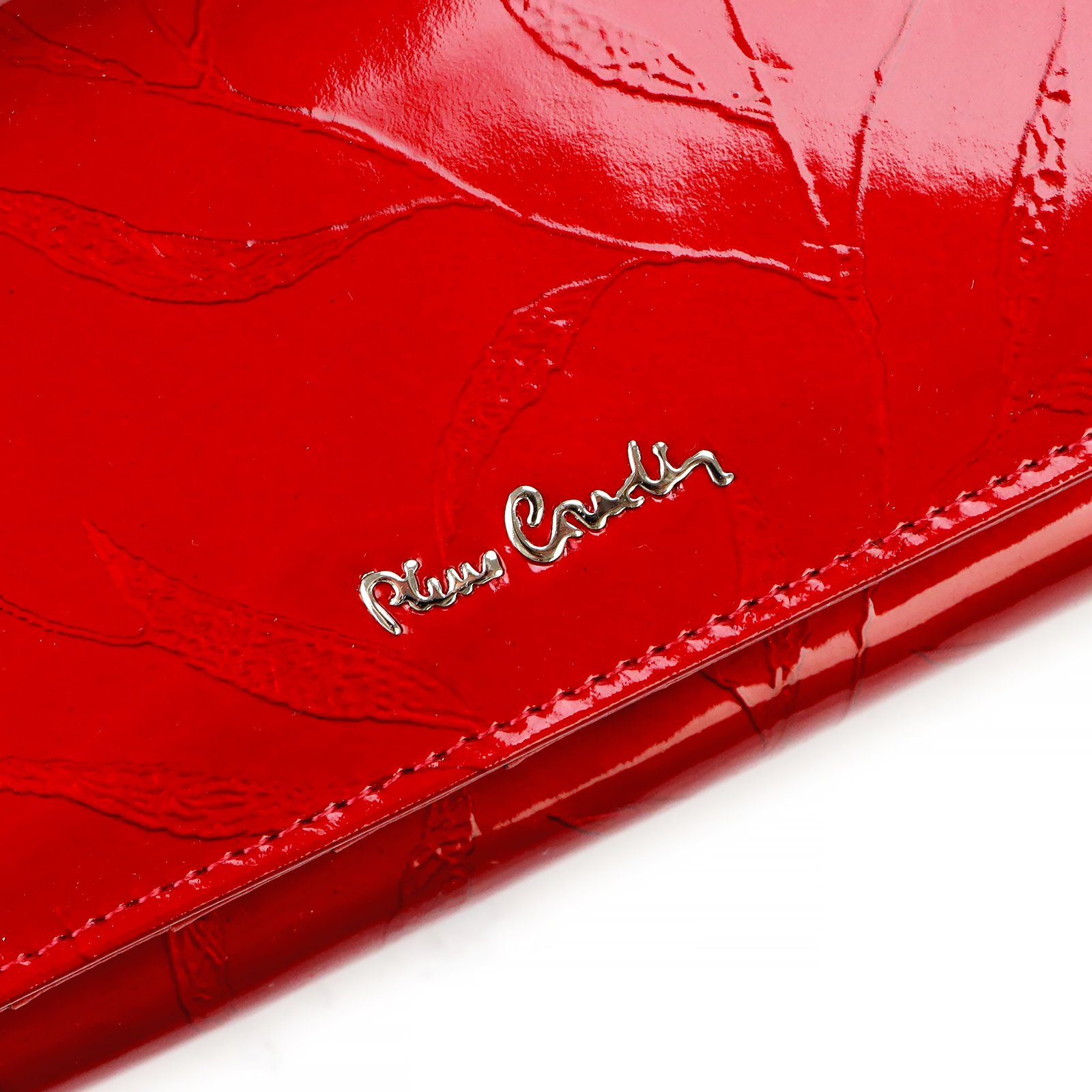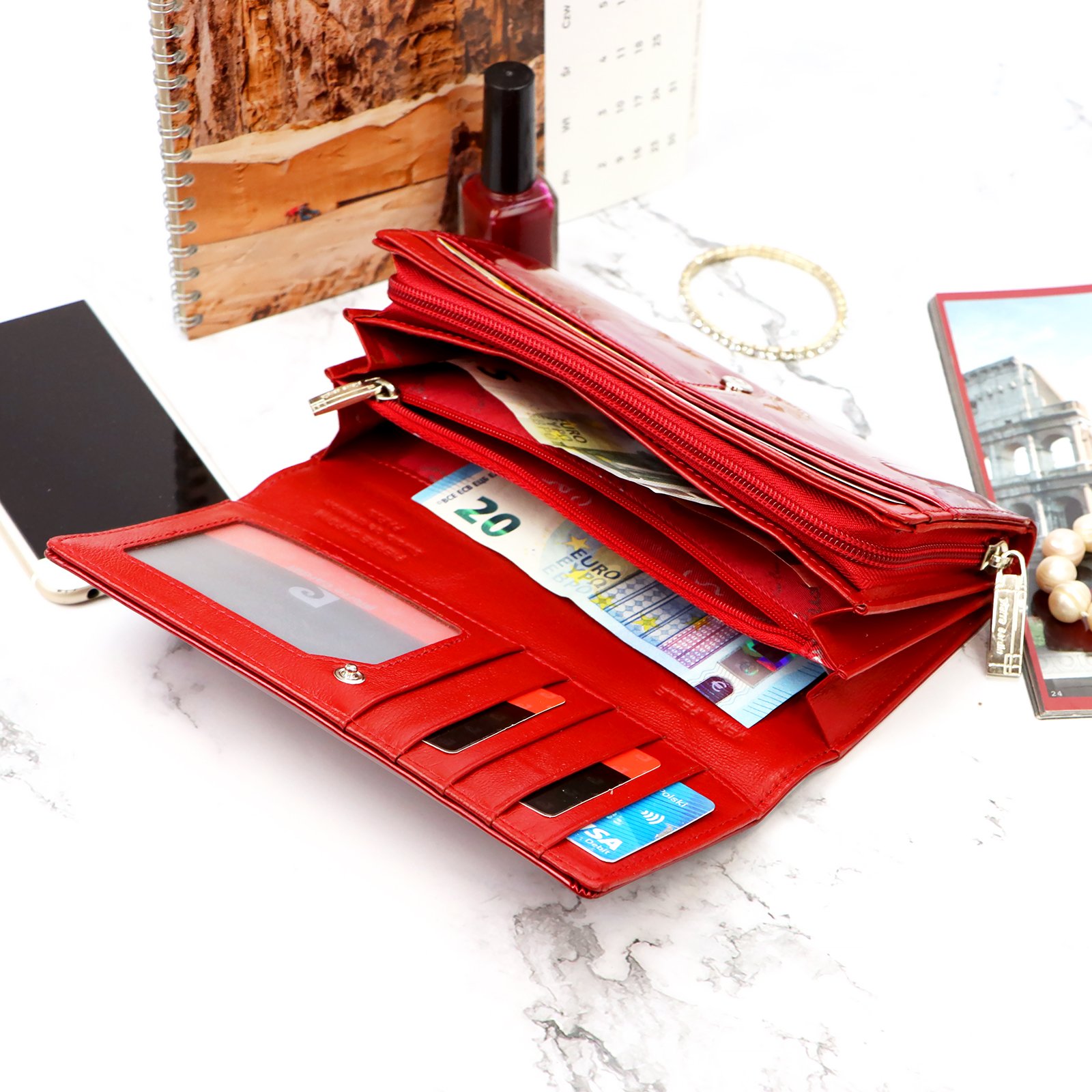 Duży portfel damski, wykonany z najwyższej jakości naturalnej, włoskiej skóry licowej lakierowanej, z wytłoczonym, delikatnym motywem liści.